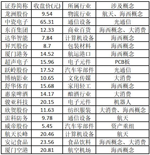 (注:创出历史新高的涨停股,说明该股人气旺盛、趋势明确,且上方无阻力,延续原上涨趋势概率较大。) 涨停板个股中,股价创出近一年新高的个股有18只(不包括创出历史新高的个股),包括龙洲股份、中瓷电子、东百集团、达华智能、昇兴股份、厦门港务、超声电子、跃岭股份、博纳影业、舒华体育、惠泉啤酒、骏亚科技、欣贺股份、雷科防务、威帝股份、航天长峰、安记食品、厦门空港,具体如下表所示。