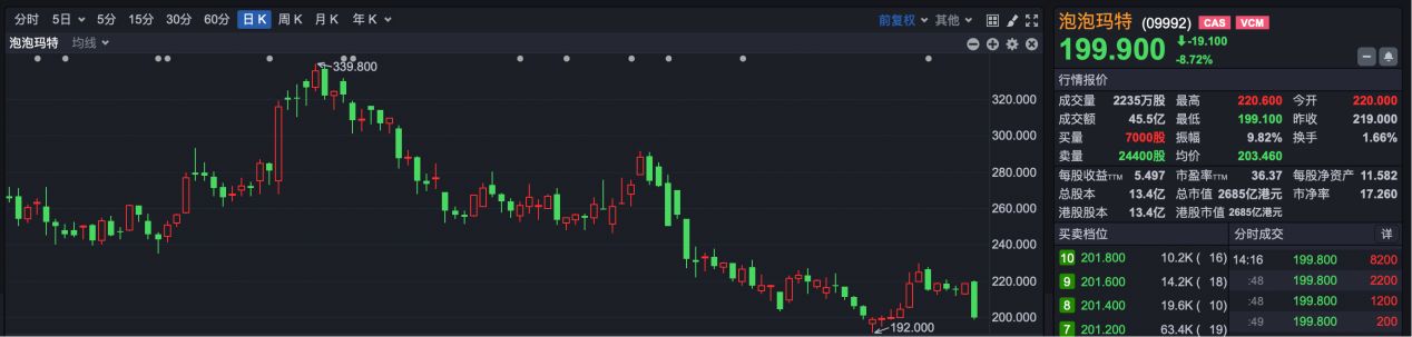 每经记者|曾子建 每经编辑|袁东 今天的港股,弱得有点过分了。 A股那边,沪指又开始冲击4000点了,创业板指数盘中涨幅更是超过3%。再看港股,恒生指数跌幅接近1%,恒生科技指数表现略好,但也只是勉强红盘而已。 这就叫没有对比,就没有伤害。 上半年,市场强的时候,强者恒强,弱者还能变强。而现在,还剩下的强者寥寥无几,曾经的强者,也是弱不禁风。 这里所说的“曾经的强者”,不就是泡泡玛特吗? 泡泡玛特股价8月份见顶之后,就一直在跌。今天盘中,股价又一度跌超8%,累计最大跌幅已经超过40%。短短几个月时间,为何市场对泡泡玛特的预期会发生如此大的变化?
