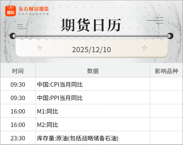 隔夜行情![]() ![]() 每日精选美联储决议前夕贵金属大幅飙升:白银史上首次站上60美元 多晶硅整合平台来了?业内人士回应 铁矿石价格“虚火”再燃 行业各方需理性辨别 宏观产经新华社:12月9日,国务院总理李强在北京钓鱼台国宾馆同主要国际经济组织负责人举行“1+10”对话会。新开发银行行长罗塞芙、世界银行行长彭安杰、国际货币基金组织总裁格奥尔基耶娃、世贸组织总干事伊维拉、联合国贸发会议秘书长格林斯潘、国际劳工组织总干事洪博、国际清算银行总经理德科斯、金融稳定理事会主席贝利、亚投行行长金立群、经合组织副秘书长鲁日奇卡出席。 澎湃新闻:路透社记者提问,近日多位欧洲领导人访问中国,表达了对中国向欧洲供应稀土的担忧。这些访问是否旨在寻求中方就确保欧洲稀土供应作出承诺,或者承诺发放稀土通用许可证?第二个问题,日本媒体报道称,由于北京和东京之间的外交争端,中国向日本出口稀土出现延误。中方对此有何评论?郭嘉昆表示,中方主管部门已经多次介绍了稀土相关物项出口管制的工作情况,中方正在依法依规处理有关问题。 人民财讯:财政部副部长廖岷就“1+10”对话会有关情况答记者问时表示,与会国际经济组织负责人认为,当前世界经济呈现复苏放缓、风险叠加的复杂态势。贸易紧张局势升级、地缘政治冲突、通胀压力与债务风险等多重挑战相互交织,不仅削弱了全球增长的确定性,也侵蚀了国际社会的合作信心。但同时,全球经济也展现出了较强的韧性,特别是中国等新兴经济体坚定维护多边贸易体系,加强国际政策沟通与协调,持续扩大开放、深化创新,在稳增长、促合作方面作出了积极贡献。 品种资讯黑色系期货 锰硅:河钢集团12月硅锰首轮询价5700元/吨,11月硅锰定价:5820元/吨。(2024年12月定价6350元/吨)。12月硅锰采量14700吨。11月采量:16000吨。(2024年12月硅锰采量:13600吨)。其中:唐钢新基地3500(+300)吨,承钢3000(-1000)吨,舞钢3100(-300)吨,邯钢3500(-500)吨,石钢400(-)吨,张宣高科1200(+200)吨。(Mysteel) 铁矿石:卫星数据显示,2025年12月1日-12月7日期间,澳大利亚、巴西七个主要港口铁矿石库存总量1195.6万吨,环比下降18.3万吨,呈小幅回落态势。当前库存水平略低于今年四季度以来的平均值。 中国47港进口铁矿石库存总量16023.98万吨,较上周一增加108.29万吨。周期内铁矿石到港量虽有所减少,但随着在港船舶陆续完成靠泊卸货,港口进口矿库存仍延续累库趋势。(Mysteel) 农产品期货 生猪:农业农村部最新数据显示,11月份全国猪肉供应充足,价格环比小幅下降。专家介绍,随着生猪产能综合调控措施的持续推进,10月末全国能繁母猪存栏为3990万头,环比降1.1%,同比减2.1%,较去年年末高点减少90万头,时隔17个月重回4000万头以下。数据显示,11月份,北京新发地市场白条猪日均上市量为2128.8头,比10月份增加10.57%,比去年同期增加7.54%,与此同时,由于大体型白条猪占比较大,使得11月份猪肉供应量达到今年以来的最高点,价格也处在近5年同期的较低水平。(央视财经) 截至12月9日14:00时,全国农产品批发市场猪肉平均价格为17.57元/公斤,比昨天下降0.5%。(农业农村部) 大豆:阿根廷经济部长Luis Caputo周二宣布,政府将下调主要谷物出口税。他在社交平台X上表示,大豆出口税将从26%降至24%,大豆副产品(如豆粕和豆油)的出口税则从24.5%下调至22.5%。此外,小麦和大麦的出口税率将由9.5%降至7.5%,玉米和高粱的出口税也从9.5%下调至8.5%。此举旨在提升阿根廷农产品在国际市场上的竞争力,并刺激农业出口,为该国亟需的外汇收入提供支持。(财联社) 12月5日,全国主要油厂进口大豆库存671万吨,周环比下降29万吨,月环比下降44万吨,同比上升69万吨,较过去三年均值上升139万吨;豆粕库存115万吨,周环比下降3万吨,月环比上升16万吨,同比上升46万吨,较过去三年同期均值上升54万吨。(国家粮油信息中心) 菜油:截止到2025年第49周末,国内进口压榨菜油库存量为40.6万吨,较上周的42.5万吨减少1.9万吨,环比下降4.47%;合同量为5.0万吨,较上周的4.9万吨增加0.1万吨,环比增加0.81%。(中国粮油商务网) 有色/贵金属期货 碳酸锂:电池级碳酸锂指数价格92649元/吨,环比上一工作日下跌76元/吨;电池级碳酸锂9.11-9.44万元/吨,均价9.275万元/吨,环比上一工作日持平;工业级碳酸锂8.99-9.08万元/吨,均价9.035万元/吨,环比上一工作日持平。(SMM) 工业硅:12月9日,SMM华东不通氧553#在9100-9300元/吨;通氧553#在9100-9300元/吨;521#在9300-9500元/吨;441#在9300-9500元/吨;421#在9500-9800元/吨;421#有机硅用在9800-10200元/吨;3303#在10200-10500元/吨。黄埔港、天津、上海、西北地区硅价也同步下调。昆明、新疆、四川地区硅价持稳。97硅今日价格同样持稳。(SMM) 黄金:道富投资管理指出,2025年金价升势创1979年以来最佳年度表现,预计在2026年将有所缓和,金价可能在每盎司4000-4500美元区间震荡走高。支撑黄金的结构性牛市周期因素包括美联储宽松政策、强劲的央行与零售需求、ETF资金流入、股债相关性上升以及全球债务问题。策略性资产重新配置及地缘政治因素,或将推升金价上探每盎司5000美元水平。(财联社) 沪铜:供应端持续偏紧是推动铜价上涨的核心因素。华鑫证券分析称,多家矿企下调中期产量预期,LME库存周内出现大量注销仓单请求。在亚洲铜业周上,智利国家铜业公司(Codelco)向中国部分买家提出2026年度长单阴极铜