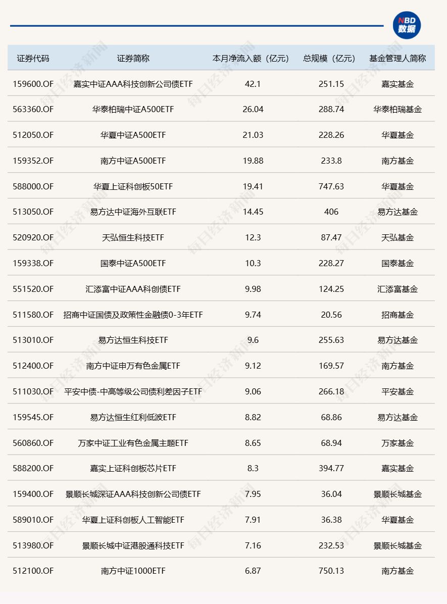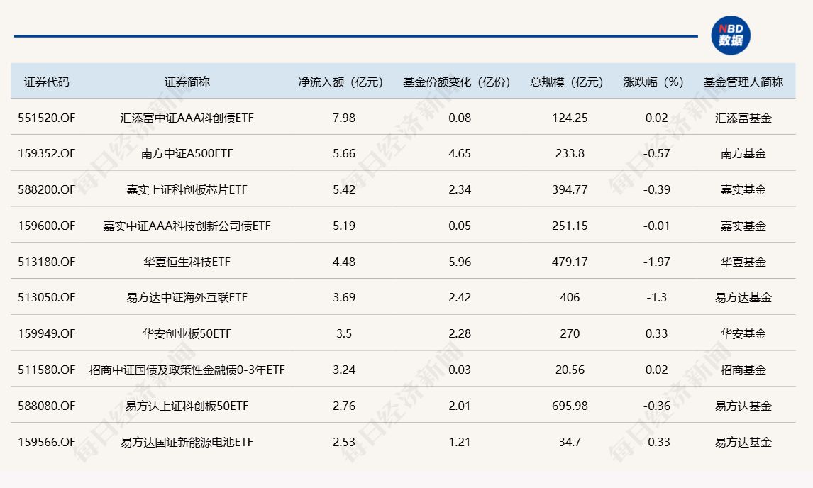 每经记者|肖芮冬 每经编辑|赵云 昨日三大指数涨跌不一,沪指、深成指震荡回落,创业板指冲高回落尾盘拉升。板块方面,算力硬件、零售、福建等板块涨幅居前,海南、有色金属、煤炭等板块跌幅居前。 Wind数据显示,在12月9日的非货币ETF市场中,汇添富中证AAA科创债ETF份额增加0.08亿份,实现净流入7.98亿元;南方中证A500ETF增加4.65亿份,对应净流入5.66亿元;嘉实上证科创板芯片ETF份额增加2.34亿份,带来净流入5.42亿元。