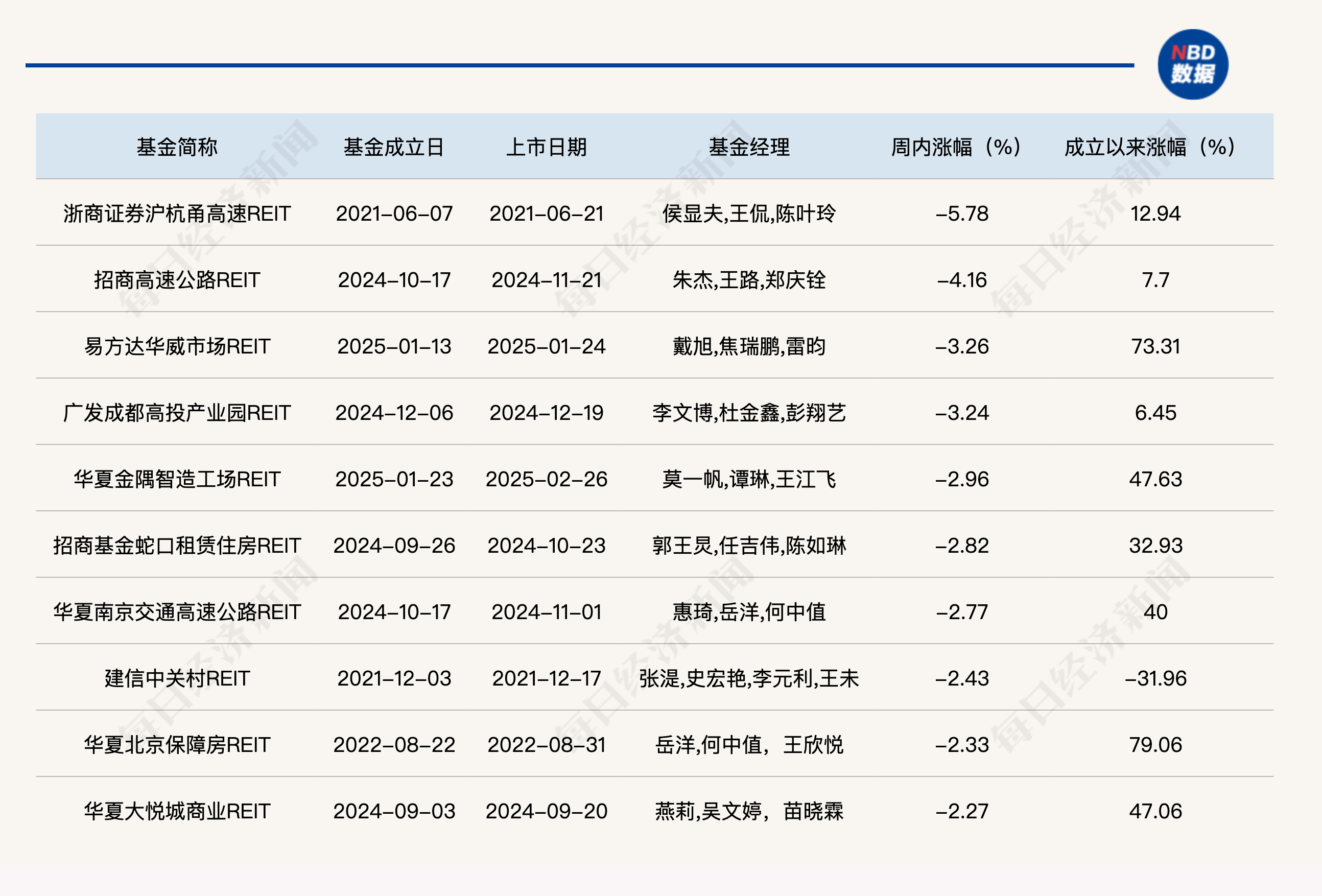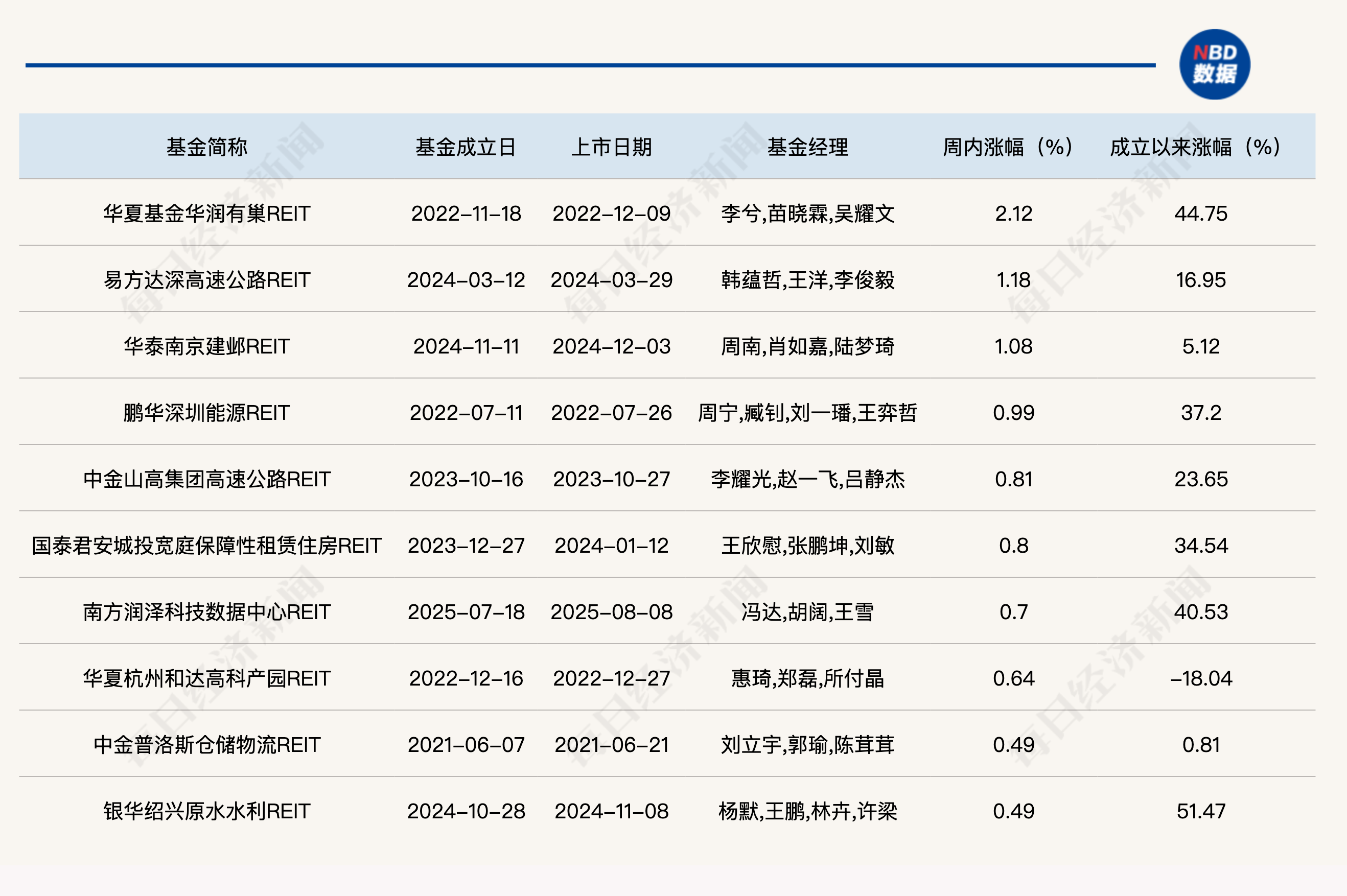每经记者|李蕾 每经编辑|肖芮冬 《每日经济新闻》记者获悉,上周债市大幅调整,REITs市场整体承压,仅在上周三短暂修复,其余四个交易日持续走低,流动性明显收缩。 截至上周五(12月5日),中证REITs全收益指数下跌0.85%,中证REITs(收盘)指数下跌0.98%,产权REITs指数下跌0.92%,经营权REITs指数下跌0.83%。 根据Wind数据,已上市的77只公募REITs产品中,环比上涨的减少至17只,下跌的达到58只,还有两只表现持平。涨幅最大的三只产品为华夏基金华润有巢REIT、易方达深高速公路REIT和华泰南京建邺REIT,上周分别上涨2.12%、1.18%和1.08%,其余产品涨幅均不足1%。跌幅最大的三只产品则为浙商证券沪杭甬高速REIT、招商高速公路REIT和易方达华威市场REIT。 政策与行业方面,上周有多项重磅动态。上周一,《基础设施领域不动产投资信托基金(REITs)项目行业范围清单(2025年版)》印发,首次将体育场馆、商旅文体健商业综合体、酒店、商业办公设施、城市更新设施纳入申报范围。 另外,12月5日,平安西安高科产业园REIT获深交所受理,为陕西省首单公募REIT。 公募REITs二级市场整体下跌,成交量回落上周,公募REITs二级市场继续回调。 Wind数据显示,截至上周五,中证REITs(收盘)指数收于805.28点,环比下跌0.47%;中证REITs全收益指数收于1031.5点,环比下跌0.85%。 来自开源证券的数据显示,上周REITs市场交易规模达4.61亿份,同比下降34.14%;成交额为19.62亿元,同比下降23.86%;区间换手率1.77%,同比下跌2.6个百分点。 从不同资产类型来看,保障房、环保、高速公路、产业园区、仓储物流、能源、消费类REITs上周涨幅分别为-0.51%、-0.47%、-1.12%、-0.95%、-0.48%、-0.14%、-1.07%。 单只产品方面,已上市的77只公募REITs产品中,环比上涨的仅有17只。涨幅最大的三只产品为华夏基金华润有巢REIT、易方达深高速公路REIT和华泰南京建邺REIT,周内分别上涨2.12%、1.18%和1.08%。 上周涨幅排名前十的公募REITs