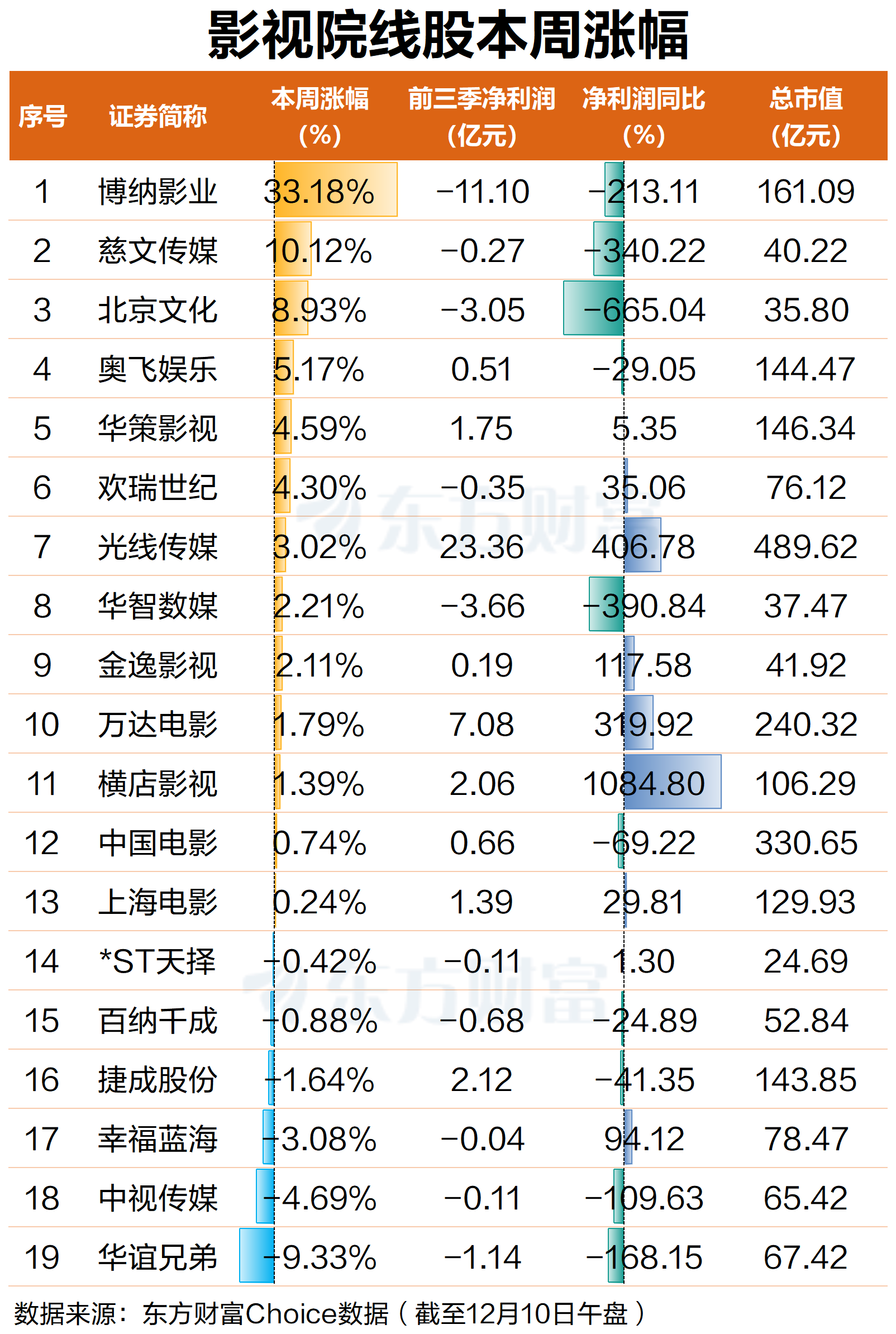 12月10日,A股影视院线股表现强势。截至早间收盘,博纳影业涨停,股价已3连板,北京文化涨超3%,中国电影、光线传媒涨超2%,万达电影、上海电影、金逸影视、奥飞娱乐横店影视等跟涨。 消息方面,当《疯狂动物城2》还在热映并刷新票房纪录的同时,另一部迪士尼系列的巨制又将来袭。12月8日,《阿凡达:火与烬》(《阿凡达3》)于第七届海南岛国际电影节期间举办中国首映礼。导演詹姆斯·卡梅隆和主演佐伊·索尔达娜亲临现场。 ![]() 图片来源:猫眼专业版 据猫眼专业版的全球影史票房榜单,排名第一位的是《阿凡达》第一部,总票房212亿元,该片开创了全球3D电影的先河;第二位是《复仇者联盟4:终局之战》,总票房为202.99亿元;第三位是阿凡达第二部,即《阿凡达:水之道》,总票房168.25亿元。 作为阿凡达系列第三部,《阿凡达:火与烬》以3小时15分钟的史诗时长,创《阿凡达》系列最长片长纪录。影片延续潘多拉星球的奇幻冒险,探索人类与自然、科技与情感的深层命题。 据悉,近日《阿凡达:火与烬》在海外首映后获得惊艳口碑,震撼视听体验获得广泛赞誉,获赞“卡梅隆让这部史诗般的巨作充满了情感冲击力”,也有评论认为影片的动作场面、视觉效果达到了新的高度。国内方面,该影片将于12月19日上映,并同步登陆IMAX影院。 《疯狂动物城2》方面,朱迪与尼克的回归引爆全球观影狂潮,影片一经上映便口碑爆棚,取得了猫眼9.7、淘票票9.7、豆瓣8.7以及烂番茄新鲜度93%、爆米花指数95%的惊艳开画成绩。 ![]() 图片来源:猫眼专业版 截至发稿,该片已连续十余日蝉联内地票房日冠,累计票房已超31亿元,成为中国影史进口动画电影的票房冠军,实现了票房与口碑的“双引爆”。猫眼专业版预测数据显示,该片内地总票房或达37.91亿元。 在《疯狂动物城2》热映、《阿凡达3》即将上映的情绪刺激下,A股影视院线股近期持续走强。据东方财富Choice数据,12月8日至今,申万影视院线板块已3连阳。成分股中,博纳影业持续领涨,累计涨幅已超33%,慈文传媒、北京文化均累计涨超10%,奥飞娱乐、欢瑞世纪、华策影视等均累计涨超4%。 ![]() 市场对博纳影业的追捧主要源自《阿凡达3》的投资收益权。资料显示,2024年1月,博纳影业全资子公司与TSG Entertainment Finance LLC签订了购买协议,并与20世纪福克斯和华特迪士尼公司签订了《回购协议》。根据协议约定,TSG授予公司包含影片《阿凡达3》《死侍与金刚狼》《猩球崛起:新世界》《异形:夺命舰》等影片投资收益权。 针对该项事宜,12月9日晚间,博纳影业发布公告称,影片《阿凡达3》尚未在全球院线上映,其票房收入尚难以预计,且公司控股子公司通过与TSG Entertainment Finance LLC合作授予公司《阿凡达3》的投资收益权比例较低,对公司短期业绩无重大影响,敬请投资者理性决策、注意投资风险。 此外,博纳影业还特别提示,公司2025年前三季度实现营业收入9.72亿元,较上年同期增长1.29%,归属于上市公司股东的净利润-11.09亿元,亏损同比增加213.11%。目前公司仍处于亏损状态,未来盈利情况尚存在不确定性。