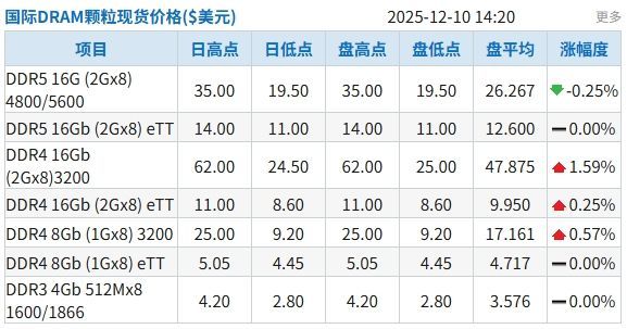 据集邦数据,今日国际DRAM颗粒现货价格整体稳定,除DDR4 16Gb (2Gx8)3200涨幅1.59%外,涨幅基本都在1%以下,也有部分颗粒小幅下跌,例如DDR5 16G (2Gx8) 4800/5600,跌幅0.25%,今日均价26.267美元。