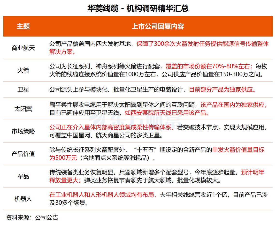 华菱线缆:已保障300余次火箭发射任务 机器人产品涉及30多个场景 华菱线缆于昨日接受中信证券、华夏理财等近40家机构集中调研。 在调研中,华菱线缆透露,公司产品覆盖国内四大发射基地,已保障300余次火箭发射任务。火箭方面,公司为长征系列、神舟系列等火箭进行配套,覆盖市场份额在70%-80%左右;卫星方面,公司源头上参与模块化、批量化卫星生产的电装设计,目前部分产品为独家供应。 在卫星太阳翼领域,华菱线缆也取得积极进展。据介绍,公司开发的扁平柔性展收电缆用于解决太阳翼到星体之间的互联问题,替代因频繁折叠导致原子氧涂层脱落的FPC方案。该产品在国内为独家供应,目前已延伸应用至卫星天线,如西安某院所天线已采用该产品。 华菱线缆特别提到,在商业互联网卫星领域,虽单星用量小于军星,但卫星数量规模大,市场空间可观,若算力卫星批量应用,太阳翼折叠电缆的需求量增长将十分显著。 据华菱线缆透露,公司正在介入星体内部高密度集成柔性传输体系,若突破技术节点实现大规模应用,可覆盖中国星网、航天商星公司的多类卫星。公司与总体单位联合研制卫星模块化集成,若实现公司产品价值有望提升至整星成本的40%左右,单星价值量将大幅增长。 机器人业务方面,华菱线缆称,公司在工业机器人和人形机器人领域均有布局,去年机器人相关线缆营收近1个亿,目前产品已涉及30多个场景。 关于传统军品业务,华菱线缆表示,相关业务恢复明显,兵器领域新增多个配套型号,以组件方式配套,今年底逐步起量,预计明年释放量更大;弹类业务恢复节奏领先于航天领域,批量化规模较大。 ![]() 华菱线缆系特种电缆领先企业、航天防热材料领军者,公司前三季度实现营收33.76亿元,同比增长8.68%;归母净利润为9216.30万元,同比增长6.85%。 二级市场方面,华菱线缆今日上涨5.39%,12月以来累计涨幅为17.09%。