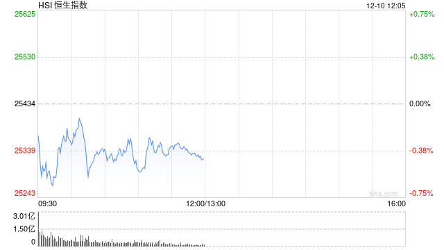 12月10日消息,港股三大指数集体下跌。截至午间收盘,恒生指数跌0.43%,报25324.75点,恒生科技指数跌0.68%,国企指数跌0.51%。盘面上,科网股涨跌不一,网易、哔哩哔哩跌超1%,腾讯跌1%,美团涨超1%;黄金股普涨,灵宝黄金涨超10%;光伏太阳能股走弱,协鑫科技跌超3%;中资券商股高开低走,招商证券跌超3%;今日两只新股上市,图达通涨34%,宝济药业涨超125%。