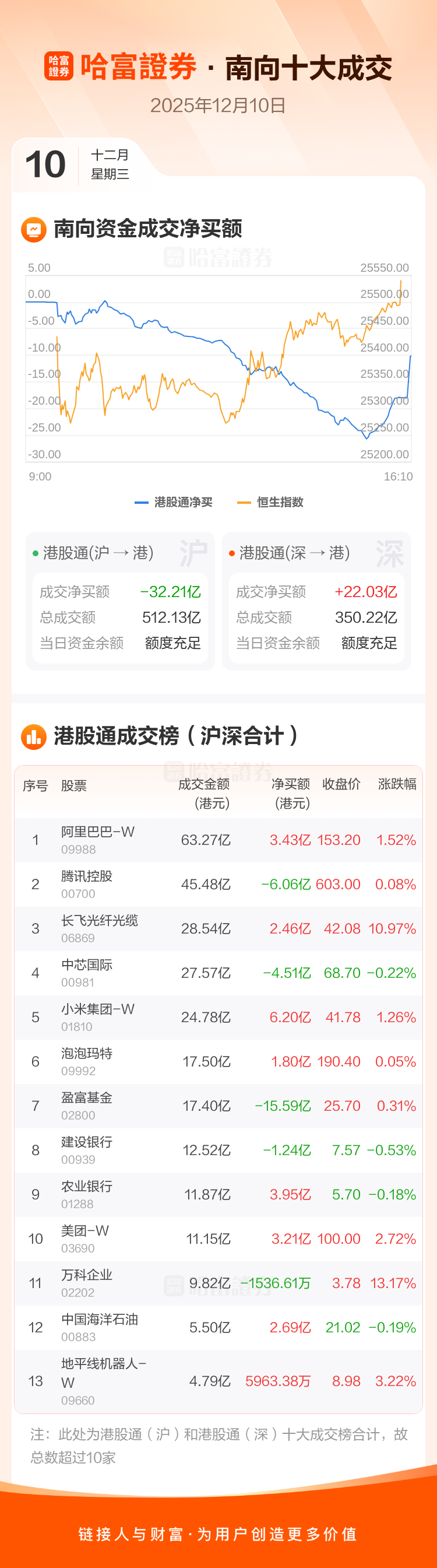 恒生指数12月10日涨0.42%,收报25540.78点。南向资金今日净卖出港股10.18亿港元。南向资金今日成交额862.35亿港元,港股大市成交1933.92亿港元。