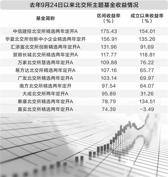 北证基金首尾业绩拉大 个股挖掘或沿三大“成长”展开 全新妙想投研助理,立即体验 ![]() 从首只基金成立算起,北证50指数基金将于12月15日迎来发展三周年,历经多次扩容后数量已突破35只(以初始基金为统计口径,下同)。首批北交所两年定开基金,则于近期迎来第二个开放期。 自去年“9·24”行情以来,有3只北证50指数基金和7只北交所主题基金收益率均超过100%。不过主题基金方面,首尾业绩差距较大,最高和最低之间相差超100个百分点。对于未来投资机会,基金经理认为,北交所市场在过去两年估值水平提高后,个股挖掘难度在加大。 指数基金年内大扩容 根据Wind统计,首只北证50指数基金成立于2022年12月15日。当年12月,还有来自嘉实基金、南方基金、广发基金等7家公募的7只北证50指数基金成立,这8只产品成为全市场首批北证50指数基金。2023年以来,北证50指数基金持续扩容,布局的公募越来越多,且出现了指数增强产品。 值得一提的是,在去年“9·24”行情的驱动下,北证50指数基金于2025年出现了三年以来最大的一次扩容。数据显示,截至12月10日,2025年以来成立的北证50指数基金数量达到了12只,既有华泰柏瑞基金、建信基金、景顺长城基金等大中型公募,但更多的是中加基金、中金基金、宝盈基金、前海开源基金、国投瑞银基金等中小型公募。 此外,还有3只北证50指数基金即将上新。其中,弘毅远方北证50指数基金12月9日公告提前结束募集,中邮北证50指数增强基金正在发行中,恒生前海北证50指数增强基金将于12月15日开始发售。包括这3只基金在内,全市场北证50指数基金数量将超过35只。 上述基金成立以来大多取得了正收益。但由于跟踪误差等因素,不同基金间的收益分化较为明显。去年9月24日以来,北证50指数累计上涨超过130%,完整运作的16只北证50指数基金中有3只收益率超过100%,分别是中欧基金、博时基金、广发基金旗下的北证50指数基金。其余基金中,最低收益率约为72%,和收益率最高的基金相差了40个百分点。 招商北证50指数基金基金经理邓童对证券时报记者表示,北证50指数基金成立以来普遍获得了较好收益,享受到了近两年北交所股票流动性折价修复红利。特别是在近一年多市场整体反弹背景下,北交所股票的上涨幅度更大一些。作为机构投资者,公募基金参与北交所,起到了长期稳定资金作用。 首尾业绩相差超100个百分点 除了指数基金外,主投北交所的还有主题基金,这些基金的业绩表现整体超过了指数基金。北交所主题基金出现的时间早于北证50指数基金,首批8只产品成立于2021年底,加上2022年和2023年成立的3只产品,北交所主题基金一共有11只,且基本采用两年定开运作方式。 从去年9月24日至今,11只北交所主题基金均有完整运作过程,业绩分化明显。具体看,11只基金中有7只在该区间获得了超100%的收益率,最高为中信建投北交所精选两年定开A,收益率为175.43%;其次是华夏北交所创新中小企业精选两年定开,收益率超过了150%;另外有3只基金收益率不足100%,最低收益率在75%左右,和最高收益率基金之间相差超100个百分点。 除北交所主题基金外,不少个股也是全市场基金的重仓股。以基金三季报为例,公募基金重仓股中的北交所个股数量超过了70只。有14只个股获得了10只及以上公募基金重仓,锦波生物和纳科诺尔均获得54只基金重仓股,并列第一;重仓持股市值分别为22.83亿元和13.12亿元。 “伴随着这两年北交所赚钱效应,很多优质的北交所个股进入全市场公募基金视野。本质上看,这是北交所的优质公司吸引了专业的机构投资者。他们是在研究某个长期成长空间的行业或在产业链实际调研时,发现该领域的某龙头正是北交所公司,包括某头部优质供应链公司、胶原蛋白产业链龙头公司等。”华夏北交所创新中小企业精选两年定开的基金经理顾鑫峰表示。 可关注三大“成长”领域 无论是主动还是被动基金,均在北交所市场实现了显著收益,但和北交所市场规模相比,北交所相关基金规模普遍不大,还有扩容空间。数据显示,截至目前,30多只北证50指数基金规模为120多亿元,11只北交所主题基金规模约58亿元,两者之和不到200亿元,而北交所市值目前已逾9000亿元。 邓童表示,北交所在过去几年快速扩容,上市公司数量及市值增长均超过3倍,场内交易量增幅更加显著。北证50指数作为北交所最先推出且最具有代表性的指数,成份股也发生了较大变化。目前,北交所仍处在快速扩容阶段,北证50指数也依然有望保持这一优势。随着上市公司逐步增多,后续指数也会逐步增加,包括宽基指数以及主题指数等,都有较大发展空间。 “从未来投资机遇看,北交所依然是‘小荷才露尖尖角’。”顾鑫峰表示,伴随着这两年北交所影响力提升,存量公司已被各类投资者相对充分挖掘,未来还会有源源不断的好公司。当前,A股IPO排队公司中有一半以上是准备来北交所上市,北交所IPO申请公司的平均净利润已从两年前的四五千万元到如今的8000万元以上。 展望2026年市场行情,中信建投北交所精选两年定开的基金经理冷文鹏对证券时报记者表示,成长型风格有望占据主导,投资需充分享受全球科技创新浪潮以及国内新质生产力持续发展的成果。一是创新成长领域,看好产业趋势以及行业政策叠加催化下的创新成长空间;二是稳健成长,重点关注管理能力、经营效率、业绩增速等指标;