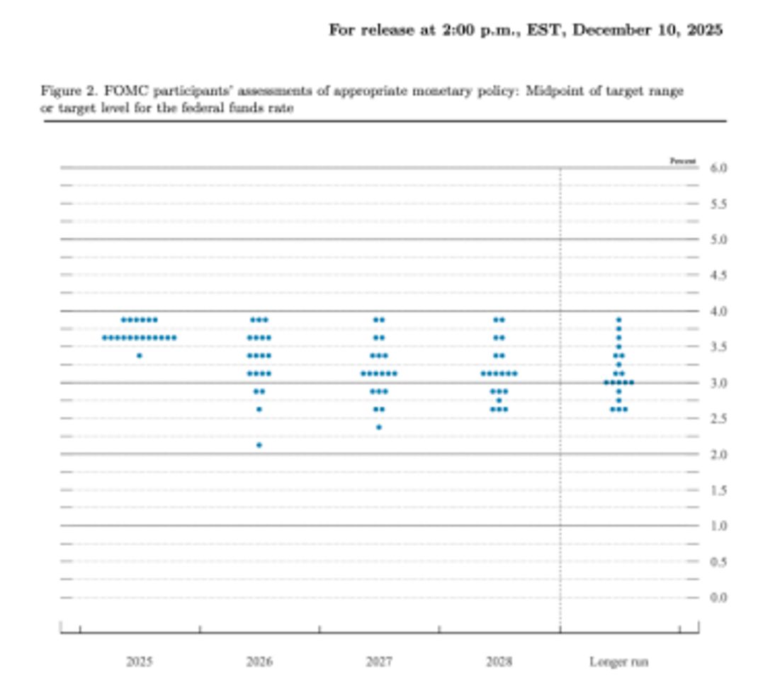 点阵图预测后续降息节奏 备受关注的未来政策预测“点阵图”显示,最新发布的点阵图预测显示,多数美联储官员预计在2026年和2027年各有一次25个基点的降息。美联储的中值预测显示,2026年利率为3.4%,2027年为3.1%,与9月份预测一致。有七位美联储官员预计,2026年不会降息,四位美联储官员预测数字显示在2026年有两次25个基点的降息。 ![]() 点阵图。图片来源:FOMC官网 美联储内部分歧同样引发关注 据央视新闻,内部主流派认为如此降息幅度就足以应对就业风险,同时保留政策灵活性,激进派多次投票反对,主张更大幅度的降息,认为就业形势比官方数据更加严峻。谨慎派则担忧降息过快可能延长通胀周期或引发资产泡沫。 就本次降息25个基点,联邦公开市场委员会12名委员中9人投票赞成,有3人投反对票。其中一名委员要求降息50个基点,另外两名委员主张维持利率不变。据悉,这是自2019年以来首次出现如此多的反对票。 此外,专家分析称,降息效果还存在滞后性并面临全球经济增长放缓、地缘政治风险等外部制约,且交织着矛盾的经济数据、美联储内部的严重分歧以及复杂的外部环境。降息,不是一个轻松的决定。 专家分析:美联储货币政策遭受多重困扰 对于本次降息,市场已有高度共识。专家分析认为,真正的焦点在于会议传递的未来政策信号和内部团结度。 分析称,美联储正面临稳定物价和实现充分就业的直接冲突。近期数据表明,美国劳动力市场正在显示更加明显的降温迹象,十一月私营部门就业意外减少3.2万个,为近两年半最大降幅,是美联储会议前最后一份关键就业指标。失业率也从六月的4.1升到九月的4.4。消费引擎亦乏力,作为经济核心动力的家庭消费出现紧张的迹象。另外一方面,美联储最关注的通胀指标仍然显著高于其2%的长期目标。 决策的复杂性还在于数据缺失加剧了困境。由于此前美国政府停摆,美联储本次会议缺乏九月以来的官方就业和通胀数据,不得不依赖非官方数据,这无异于蒙眼决策,增加了误判风险。 据央视财经,分析人士指出,美国通胀上行压力没有出现加剧趋势,但就业市场呈现出进一步疲软的态势,美联储希望通过降息来提振实体经济活力。展望未来,市场人士预计,由于美国联邦政府此前“停摆”导致关键经济数据缺失,美联储难以就未来降息路径给予明确指引,明年大概率将延续“步步为营”的谨慎降息路径。多家华尔街投行预计,美联储2026年累计降息幅度为50个基点至75个基点。 (文章来源:每日经济新闻) |
