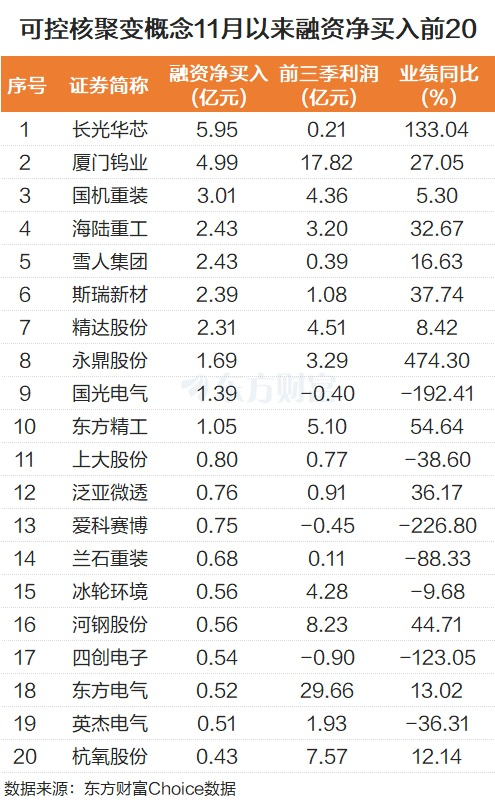 板块受政策利好刺激 而在政策方面,近期对于可控核聚变也是友善的。12月4日,中法签订《中国国家原子能机构和法国原子能和替代能源委员会第十五个和平利用核能合作议定书》。根据合作议定书,双方将加强核基础研究、核技术应用、核聚变技术、第三国核能市场开发、核燃料循环与放射性废物管理、核安保与核应急、核专业人才培养等合作。 此外,近期多地披露的“十五五”规划建议中,“可控核聚变”“核聚变能”也被频繁提及。比如广东的“十五五”规划建议中提到,前瞻布局未来产业,推动量子科技、生物制造、氢能和核聚变能、脑机接口等成为新的经济增长点。 融资净买入前20个股 近来,可控核聚变概念也被杠杆资金积极抢筹,11月以来合计净流入超10亿元。个股而言,长光华芯被融资净买入最多,为5.95亿元。该股前三季度归母净利润为0.21亿元,同比增长133.04%。 厦门钨业紧随其后,被融资净买入4.99亿元。国机重装、海陆重工、雪人集团、斯瑞新材、精达股份也被融资净买入居前,金额均超过2亿元。 ![]() 上市公司积极回应 在可控核聚变持续成为市场热点的背景下,不少上市公司也纷纷回应了公司在可控核聚变领域的应用。 比如西子洁能表示公司已具备核聚变装置冷却水系统三级回路设备的全流程供货能力;航天晨光则表示公司已参与国际热核聚变实验堆(ITER)计划等一批国内外核聚变重点项目;博盈特焊表示公司的堆焊或增材制造等工艺技术可以应用于可控核聚变领域等等。 中金公司研报指出,可控核聚变作为清洁基荷能源,不仅能支撑高耗能产业降碳升级,还可衍生多领域应用,当前产业链上中下游协同突破,核心材料、关键设备与集成设计环节技术成熟度持续提升,为商业化奠定基础。建议重点关注超导线缆、激光器、传感监测与控制系统等上下游产业链投资机会。 光大证券则表示,基于未来AI产业发展对于用电结构的重塑,可控核聚变产业具备长期增长潜力。伴随可控核聚变产业进程的不断推进,高价值量环节公司有望持续受益。 (文章来源:东方财富研究中心) |