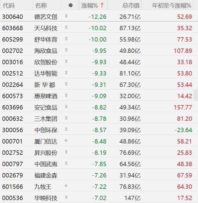 格隆汇12月11日|A股市场福建股集体回调,其中,德艺文创(300640)涨超12%,天马科技、舒华体育、海欣食品(002702)跌停,欣贺股份、达华智能(002512)、新华都(002264)、惠泉啤酒(600573)逼近跌停,安记食品(603696)、三木集团(000632)、中创环保、厦门信达(000701)、N兴股份跌超8%,中国武夷(000797)、福建金森(002679)、九牧王(601566)、华映科技(000536)跌超7%。