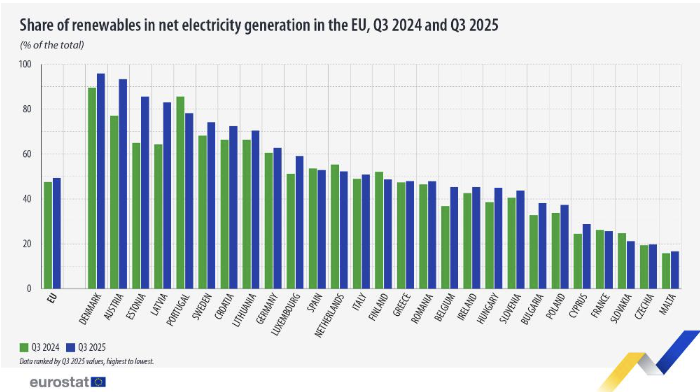 欧盟委员会数据显示,2025年第三季度,欧盟净发电量中有49.3%来自可再生能源,较2024年同期的47.5%增长了3.8%。在欧盟国家中,2025年第三季度,丹麦以95.9%的可再生能源在净发电中的比例最高,其次是奥地利(93.3%)和爱沙尼亚(85.6%)。可再生能源比例最低的州分别是马耳他(16.6%)、捷克(19.7%)和斯洛伐克(21.1%)。