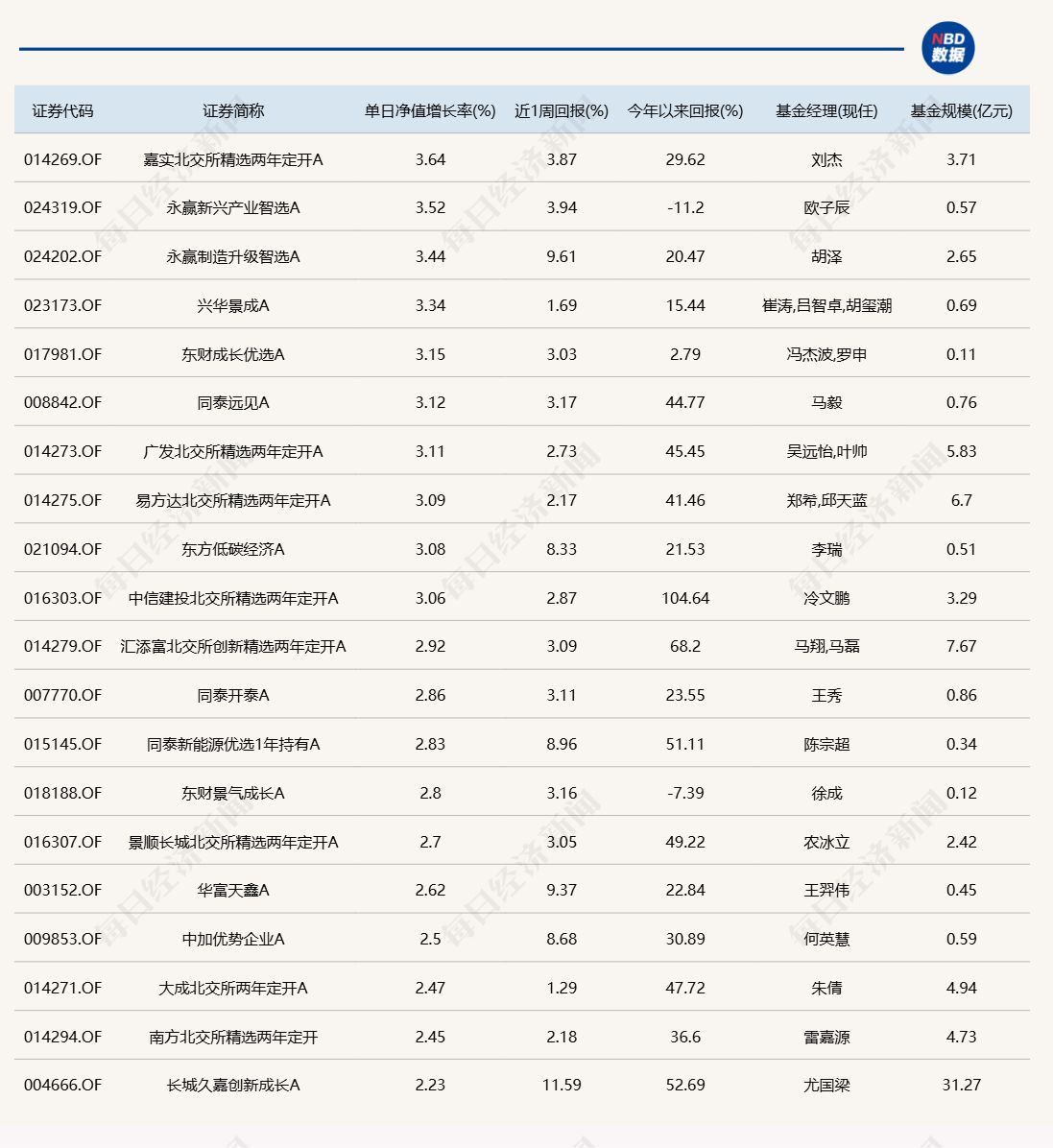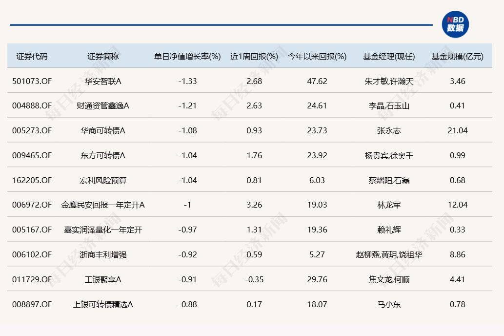 每经记者|肖芮冬 每经编辑|赵云 12月11日,市场震荡调整,沪指高开低走,创业板指冲高回落,此前一度涨超1%。板块方面,商业航天、次新股等板块涨幅居前,福建、房地产等板块跌幅居前。全市场近4400只个股下跌。沪深两市成交额1.86万亿元,较上一个交易日放量786亿。 下面一起来看今天公募基金的表现。 (注:榜单1、榜单2仅选取灵活配置型、偏股混合型和普通股票型三类产品作为主动基金的代表,纳入统计;债基相关榜单包括各类主、被动债券型基金) 1.单日涨幅榜