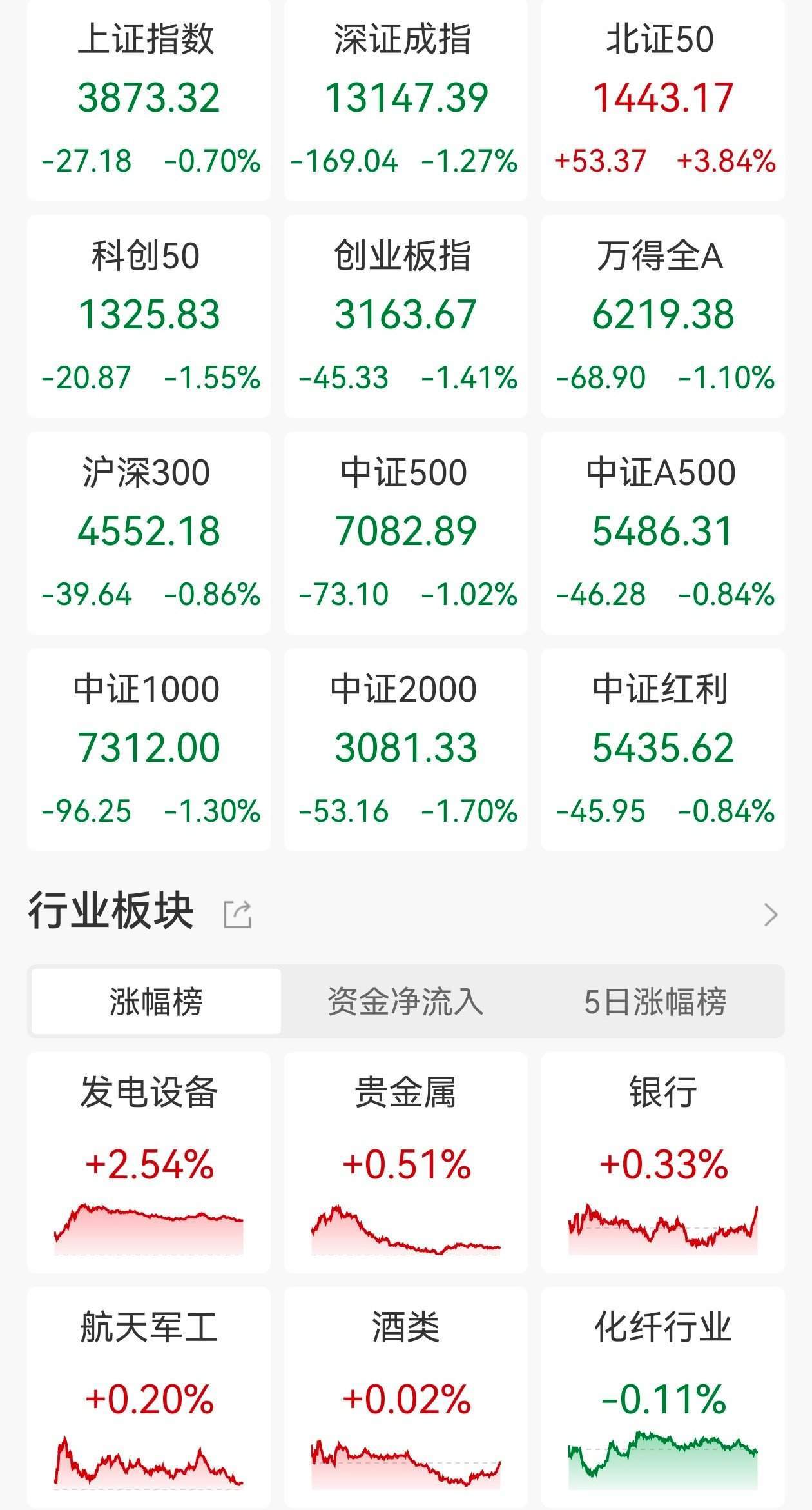 格隆汇12月11日|A股三大指数今日高开后震荡下行,截至收盘,沪指跌0.7%报3873点,深证成指跌1.27%,创业板指跌1.41%,北证50指数逆市上涨3.84%。全市场成交额1.89万亿元,较前一交易日增量936亿元,超4300股下跌。