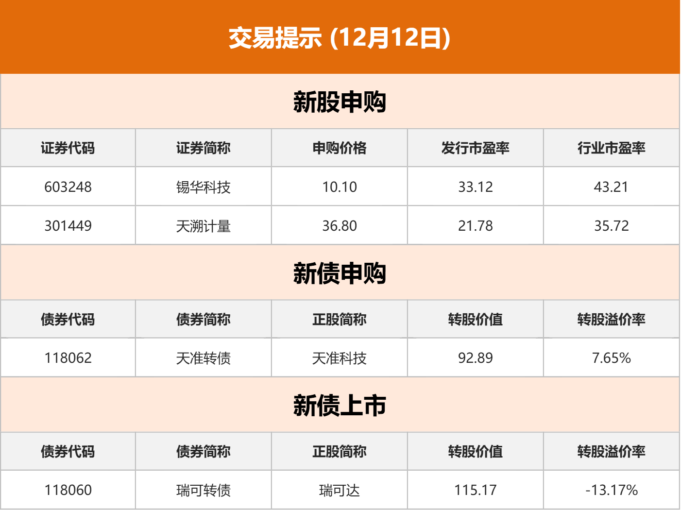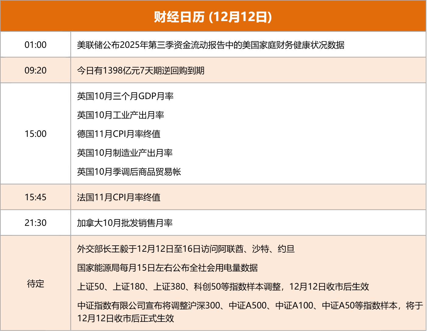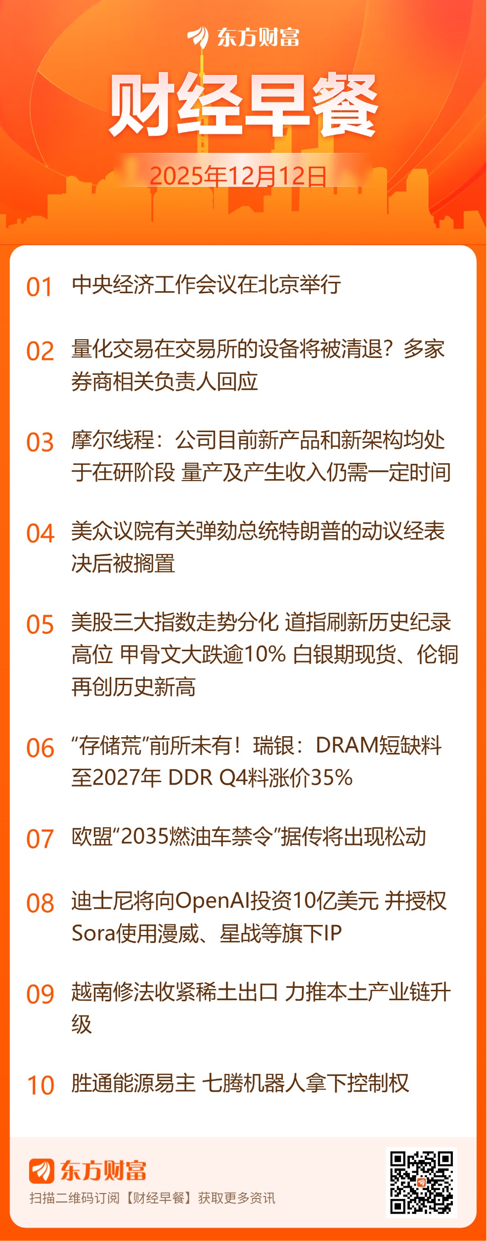 公司新闻摩尔线程:公司基于自主研发的MUSA架构,将保持较高研发投入和进行产品迭代。但与部分国际巨头相比,公司在综合研发实力、核心技术积累、产品客户生态等方面仍存在一定的差距。公司目前新产品和新架构均处于在研阶段,量产及产生收入仍需一定时间。 南都电源:公司于近日收到公司控股股东杭州南都电源有限公司、上海益都实业有限公司、上海南都集团有限公司通知,获悉其正在筹划控制权变更、促进再生铅板块股权出售的相关事宜。经申请,公司股票自2025年12月12日开市起停牌,预计停牌时间不超过2个交易日。 万科A:公司之控股子公司为满足经营需要,继续通过信用保证、股权质押等方式为相关贷款提供担保。截至2025年10月31日,公司及控股子公司担保余额844.76亿元,占2024年末经审计归属于上市公司股东净资产比重为41.68%,公司无逾期担保事项。 特发信息:针对公司因收购深圳特发东智科技有限公司被合同诈骗、职务侵占一案,公司于近日收到广东省深圳市中级人民法院出具的《刑事判决书》。本次刑事判决仅为一审判决,公司为被害单位,目前判决尚未生效,案件最终判决及后续执行结果尚存在不确定性,对公司本期利润和期后利润的影响存在一定不确定性。 蓝盾光电:公司及公司控制的蓝芯合伙经与珠海洛恒共同协商后,拟终止《股权转让协议》并签署《关于上海星思半导体有限责任公司之股权转让协议之终止协议》。 金城医药:公司收到实控人赵叶青的通知,其收到证监会《行政处罚决定书》,2017年8月18日至2020年2月10日,赵叶青、王震、刘峰3人共同操纵“金城医药”股票。 兆新股份:公司拟以现金支付方式收购优得新能源科技(宁波)有限公司(简称“优得新能源”)70%股权,对应的交易对价上限为2.2亿元。交易完成后,优得新能源将成为公司控股子公司。 泓淋电力:公司控股子公司达为互联生产的高速铜缆连接产品已实现批量出货,主要客户包括安费诺、泰科、莫仕等,达为互联产品供应下游客户后,将配套应用于国际及国内主流服务器厂商的终端设备使用。 海格通信:2025年12月11日,由陕西无人装备科技有限责任公司委托,航空工业第一飞机设计研究院设计、公司控股子公司西安驰达飞机承制的“九天”无人机在陕西蒲城圆满完成首飞任务。 胜通能源:控股股东、实际控制人魏吉胜等拟将其持有的公司8464.38万股股份(占胜通能源总股本的29.99%)转让给七腾机器人有限公司及其一致人。本次交易完成后,公司控股股东变更为“七腾机器人”,实际控制人变更为朱冬。公司股票将于2025年12月12日开市起复牌。 >">点击查看更多上市公司重大公告>> 环球市场![]() 弹劾总统特朗普的动议被美众议院搁置:当地时间12月11日,美国众议院以237票赞成、140票反对的投票结果,搁置了得克萨斯州国会众议员阿尔·格林提出的弹劾美国总统唐纳德·特朗普的动议。所有共和党议员都投票支持这项所谓的“搁置动议”,而尽管许多众议院民主党议员私下里认为特朗普不应该继续担任总统,或者应该被弹劾,但他们大多不愿推进这项决议。 GPT-5.2:OpenAI介绍称,GPT5.2是迄今为止在“专业知识工作方面”表现最好的模型系列,在制作电子表格、制作演示文稿、图像感知、编写代码以及理解长上下文等方面都优于前代产品。OpenAI特别强调,GPT5.2 Thinking是迄今为止最适合现实世界专业用途的模型。在评估涵盖44个职业的知识型工作任务的GDPval测试中,有70.9%的对比结果优于或持平于顶尖行业专业人士,这些任务包括制作销售演示文稿、会计电子表格、制造流程图或短视频等。 迪士尼将向OpenAI投资10亿美元:当地时间周四(12月11日),迪士尼宣布将向人工智能(AI)研究公司OpenAI投资10亿美元,同时授权后者在AI视频生成工具Sora使用旗下众多IP。根据授权协议,从明年年初开始,Sora和ChatGPT Images将可以使用迪士尼、漫威、皮克斯和《星球大战》等IP中超过200个角色创作内容,但不包含任何演员的肖像或声音。迪士尼将获得购买更多OpenAI股权的认股权证,并成为OpenAI的主要客户之一。此外,部分由用户生成的视频将被放到迪士尼Disney+流媒体平台上播放。 欧盟“2035燃油车禁令”据传将出现松动:周四的最新消息称,受到区域内一些主要汽车生产国施压,欧盟正在考虑延后其对燃油发动机的禁令。据知情人士称,欧委会的策略是把允许插电式混合动力和增程式车辆使用燃油发动机的时间延长5年,至2040年。延长的条件包括这些车辆将使用先进生物燃料和所谓的电能燃料(E-fuel),并在制造时使用“绿色钢材”。取决于具体参数,这种妥协仍有可能使欧盟争取在2035年前实现新乘用车零排放。 越南修法收紧稀土出口:当地时间周四(12月11日),越南国会表决通过一项修订法案,该法案限制精炼稀土出口,并重申禁止稀土矿石出口。该法案将于明年1月份生效,越南政府将“严格”管控稀土的勘探、开采和加工,只有获得政府批准的公司才能开采、加工和使用该国的稀土,并禁止了稀土原矿出口。 交易提示![]() 点击立即参与申购>> 债市纵览Shibor:12月11日,隔夜shibor报1.2830%,下跌1.50个基点;7天shibor报1.4320%,下跌0.70个基点;14天shibor报1.5000%,与前一交易日持平。1月shibor报1.5240%,上涨0.10个基点;3月shibor报1.5840%,上涨0.20个基点。 欧债:欧市尾盘,英国10年期国债收益率跌2.2个基点。德国10年期国债收益率跌