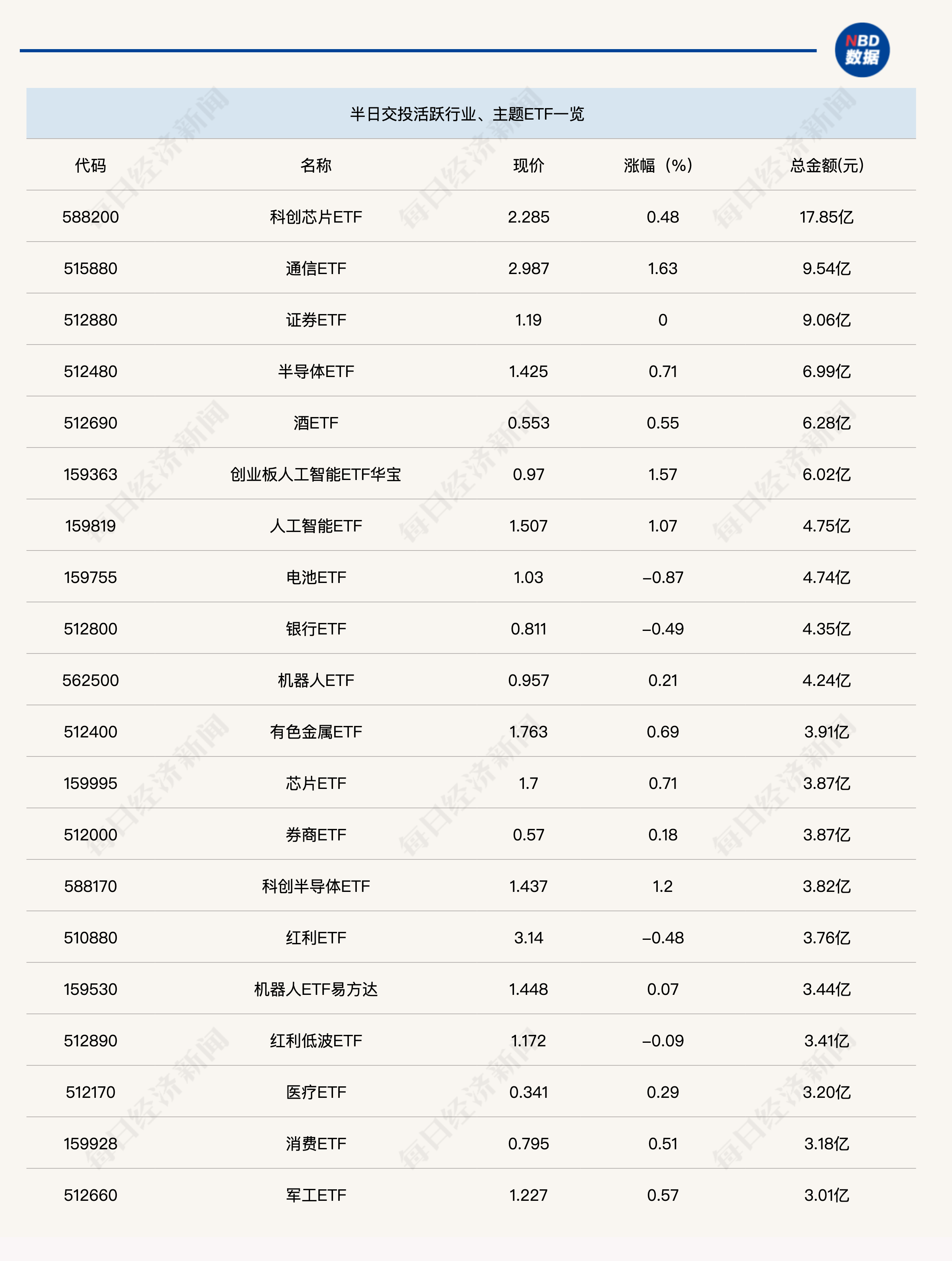 每经记者|刘明涛 每经编辑|肖芮冬 今日上午,ETF交投较为平淡。行业、主题ETF中,仅科创芯片ETF(588200)半日成交金额超过15亿元;跨境ETF方面,香港证券ETF(513090)半日成交金额达到41亿元,其余ETF半日成交金额则未超过30亿元。