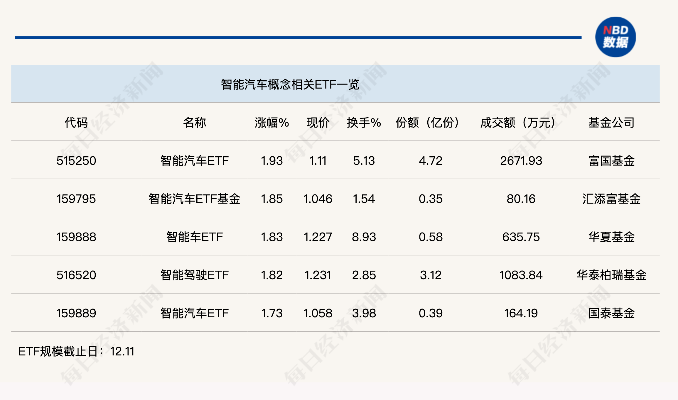 投资逻辑来看,整体来看,政策端的标准完善与基建布局为技术迭代铺路,企业端的智驾功能升级与座舱AI创新加速落地,二者形成合力推动行业从技术突破向规模化应用迈进,头部企业凭借技术与生态优势有望进一步巩固竞争地位。 点评:智能汽车ETF(515250)半日涨幅为1.93%,份额为4.72亿份,上午成交金额为2672万元。该ETF追踪的是中证智能汽车主题指数,追踪该指数的ETF还包括智能车ETF(159888)、智能驾驶ETF(516520)等。 中证智能汽车主题指数选取为智能汽车提供终端感知、平台应用的公司,以及其他受益于智能汽车的代表性公司作为样本,以反映智能汽车产业公司的整体表现。市值分布上,CS智汽车指数成分股总市值主要集中于1000亿元以下。行业分布方面,该指数重点布局电子、汽车和计算机行业。