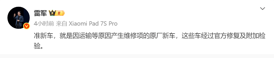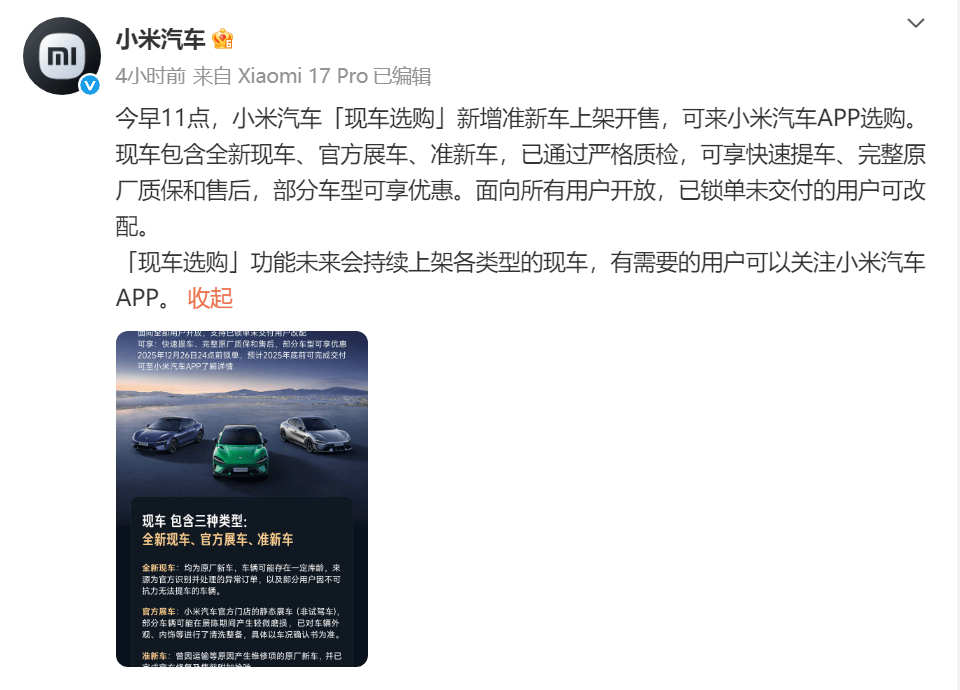 小米汽车称,现车包含全新现车、官方展车、准新车。所有现车均已通过严格质检,部分车型经官方修复,均为未登记车辆,享完整原厂质保和售后。车辆可能存在一定库龄。 准新车面向所有用户开放,已锁单未交付的用户可改配。2025年12月26日24点前锁单,预计2025年底前可提车。如因小米汽车的原因导致2026年完成开票交付,可享跨年购置税补贴。 小米创办人雷军对此回应称,准新车,就是因运输等原因产生维修项的原厂新车,这些车经过官方修复及附加检验。
