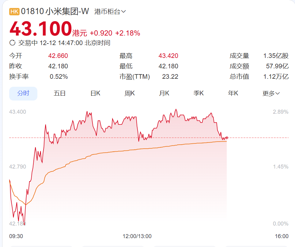 图片来源:雷军微博 据悉,小米汽车正在加速渠道扩张,构建覆盖全国的销售服务体系。官方数据显示,11月,小米汽车新增17家门店,12月计划新增36家门店。截至11月30日,小米汽车在全国已有249家服务网点,覆盖144个城市。 值得注意的是,小米汽车业务已实现单季度盈利。财报显示,第三季度,小米智能电动汽车及AI等创新业务分部收入290亿元,同比增长超199%。其中,智能电动汽车收入283亿元,其他相关收入7亿元。小米汽车及AI(人工智能)等创新业务分部首次实现单季度经营收益转正,实现单季经营收益7亿元。 雷军12月1日在个人微博表态称,小米坚持技术为本,过去五年投入了超过1000亿元研发费用,预计未来五年投入将超过2000亿元研发费用。 12月12日,小米股价上涨,截至发稿涨2.18%,总市值1.12万亿港元。