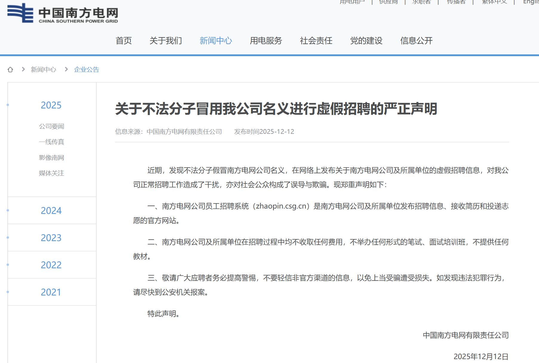 每经编辑|张锦河 12月12日,中国南方电网发布《关于不法分子冒用我公司名义进行虚假招聘的严正声明》。 近期,发现不法分子假冒南方电网公司名义,在网络上发布关于南方电网公司及所属单位的虚假招聘信息,对我公司正常招聘工作造成了干扰,亦对社会公众构成了误导与欺骗。现郑重声明如下: 一、南方电网公司员工招聘系统(zhaopin.csg.cn)是南方电网公司及所属单位发布招聘信息、接收简历和投递志愿的官方网站。 二、南方电网公司及所属单位在招聘过程中均不收取任何费用,不举办任何形式的笔试、面试培训班,不提供任何教材。 三、敬请广大应聘者务必提高警惕,不要轻信非官方渠道的信息,以免上当受骗遭受损失。如发现违法犯罪行为,请尽快到公安机关报案。