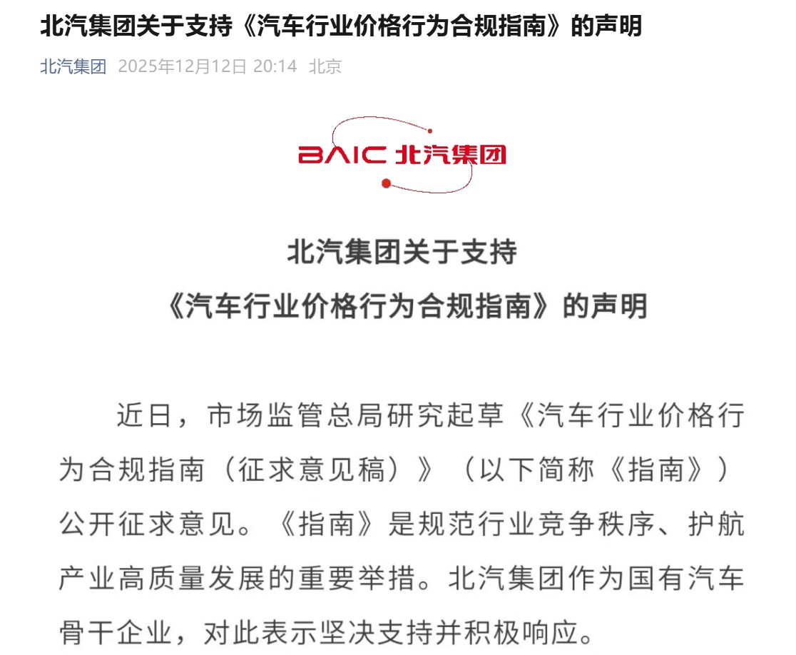 北汽集团也发声明称,近日,市场监管总局研究起草《汽车行业价格行为合规指南 (征求意见稿)》(以下简称《指南》) 公开征求意见。《指南》是规范行业竞争秩序、护航产业高质量发展的重要举措。北汽集团作为国有汽车骨干企业,对此表示坚决支持并积极响应。 汽车产业作为国民经济支柱,其健康发展关乎产业链、供应链稳定,消费者合法权益以及国家制造业实力提升。《指南》为企业价格行为提供明确指引,将有效推动形成统一开放、竞争有序的市场环境。 北汽集团始终坚守依法合规经营底线,将完善价格合规管理体系,将指南要求嵌入产品定价、经销商管理、促销推广的全流程。严守公平竞争原则,坚决杜绝低于成本价倾销、虚假宣传等违规行为,规范明码标价,保障消费者知情权。发挥产业链“链长”作用,带动上下游伙伴共同落实合规要求,构建互利共赢的产业命运共同体。 北汽集团将以合规经营筑牢发展根基,以技术创新驱动价值增长,与行业同仁携手维护公平竞争秩序,共同书写中国汽车产业高质量发展新篇章,为消费者提供更优质的产品与服务。
