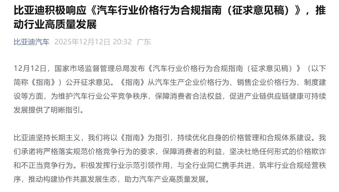 每经编辑|张锦河 据新华社,市场监管总局12日发布《汽车行业价格行为合规指南(征求意见稿)》,向社会公开征求意见。 据介绍,为统一监管规则,明确法律边界,引导各汽车生产销售企业依法合规经营,市场监管总局研究起草了征求意见稿。 征求意见稿共五章28条,主要内容包括:细化汽车生产企业价格行为规范,明确了从整车到零配件生产、从定价策略到销售行为各环节的价格合规要求;明确汽车销售企业价格行为要求,聚焦汽车新车销售环节,着力规范未按规定明码标价、虚假促销等突出问题;引导建立健全内部合规管理制度,指导汽车生产销售企业构建系统化的内部价格合规管理体系,从源头预防价格违法行为。 12月12日,比亚迪发文称,12月12日,国家市场监督管理总局发布《汽车行业价格行为合规指南(征求意见稿)》(以下简称《指南》)公开征求意见。《指南》从汽车生产企业价格行为、销售企业价格行为、制度建设等方面,为维护汽车行业公平竞争秩序,保障消费者合法权益,促进产业链供应链健康可持续发展提供了明晰指引。 比亚迪坚持长期主义,我们将以《指南》为指引,持续优化自身的价格管理和合规体系建设。我们承诺将严格落实规范价格竞争行为的要求,保障消费者的利益,坚决杜绝任何形式的价格欺诈和不正当竞争行为。积极发挥行业示范引领作用,与全行业同仁携手共进,筑牢行业合规经营秩序,推动构建协作共赢发展生态,助力汽车产业高质量发展。