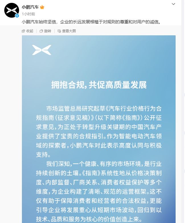 同日,小鹏汽车官博发文称,公司对市场监管总局研究起草的《汽车行业价格行为合规指南(征求意见稿)》表示高度认同与积极支持。小鹏汽车表示,将全面审视并持续优化自身的价格管理与合规体系,确保从产品定价到销售服务的每一个环节都更加透明、规范。承诺将严格遵守明码标价原则,保障消费者的知情权与选择权,坚决杜绝任何形式的价格欺诈与不正当竞争行为。