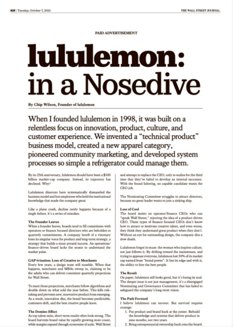 (图:创始人奇普・威尔逊在《华尔街日报》上登出整版公开信,指控管理层战略错误) 值得一提的是,露露乐蒙创始人奇普・威尔逊(Chip Wilson)的公开指控,也将内部矛盾摆上了台面。 两个月前,威尔逊在《华尔街日报》刊登广告直言,公司“失去了酷劲”。他将此归咎于领导层只会“讨好华尔街”,并不“以产品为导向”,也无法吸引或激励创造性人才。他尖锐地比喻,“就像飞机失事一样,坠落很少是因为一次失误造成的,而是一系列错误造成的。” 威尔逊认为,露露乐蒙在创立之初拥有多项护城河,包括“技术型产品”、健全的商业模式和敏锐的市场营销。但随着公司任由创意人才流失。“通过向主流靠拢,试图取悦所有人,Lululemon 损失了 50% 的市值,而这些市值原本来自‘品牌影响力’。它失去了竞争优势,也失去了聘请最优秀人才的能力。” 他表示,“没有哪个伟大的领导者愿意加入一艘正在下沉的船”。 虽然威尔逊在2015年离开董事会,10年未参与露露乐蒙的企业运营,但他仍持有约8%的公司股份。重要股东的公开发难,也让CEO备受股东群体的压力。 明星们迷恋上了Alo? 正是在露露乐蒙显露疲态的窗口期,以一众新兴品牌发动了精准攻势,成为加速其危机显现的关键外部力量。其中,Alo Yoga的攻势最为抢眼。