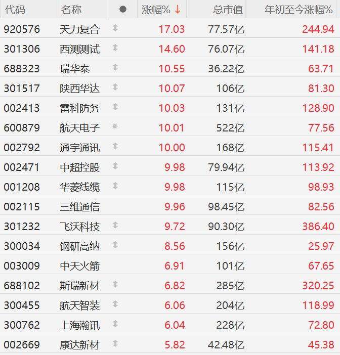 格隆汇12月15日|A股市场商业航天股再度集体爆发,截至半日收盘,天力复合涨17%,西测测试涨超14%,瑞华泰、陕西华达涨超10%,雷科防务(002413)、航天电子(600879)、通宇通讯(002792)、中超控股(002471)、华菱线缆、三维通信10CM涨停,飞沃科技涨超9%,钢研高纳(300034)涨超8%,中天火箭、斯瑞新材、航天智装、上海瀚讯(300762)涨超6%。
