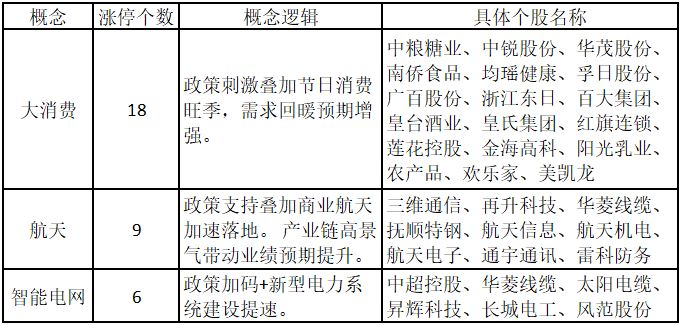 (注:行业涨停板个股越多,说明该行业被资金重点关注,是当前热门行业。) 从概念特征来看,今日涨停板个股中,大消费、航天、智能电网概念的个股最多。