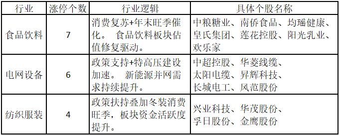 每经记者|闫峰峰 每经编辑|何建川 各位投资者,大家好。 涨跌停板数据,不仅是反映板块和个股强弱的重要指标,更是体现市场情绪与资金流向的重要参考。那么,今日的涨停个股有哪些特点呢?哪些涨停股又值得重点关注?欢迎大家关注微信公众号“道达号”,其“道达涨停复盘”栏目为大家解读。 今日,上证指数收盘下跌0.55%,深证成指下跌1.10%,沪深A股涨跌幅的中位数为下跌0.27%。 涨停板方面,今日市场资金打板情绪有所消退。航天板块则延续涨停热度,有9只航天概念股涨停,涨停数量位居前列。主力资金净流入金额排名前5的涨停股中,有4只属于航天板块。不过,今日涨停最多的是大消费板块,有18只个股涨停,涨停人气明显增加。 消息面上,12月14日,商务部办公厅、中国人民银行办公厅、金融监管总局办公厅联合印发《关于加强商务和金融协同更大力度提振消费的通知》,指导地方相关部门和金融机构加强协同,精准施策推动惠民生和促消费紧密结合,形成提振和扩大消费的更大工作合力。 12月15日,国家统计局发布的数据显示,今年1月份至11月份,社会消费品零售总额456067亿元,同比增长4.0%。其中,除汽车以外的消费品零售额411637亿元,同比增长4.6%。 一、市场总览及板块特征 沪深两市(不含ST个股)涨停59家,较上一交易日减少19家;跌停9家,较上一交易日减少6家。 从行业特征来看,今日涨停板个股中,食品饮料、电网设备、纺织服装行业的个股最多。