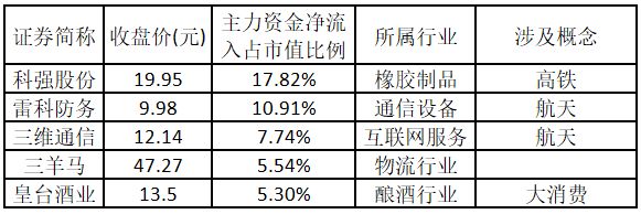 (注:主力资金净流入金额越多的涨停股,说明该股被主力资金重点关注,值得重点关注。) 主力资金净流入金额占市值比例排名前5的个股分别为科强股份、雷科防务、三维通信、三羊马、皇台酒业。欢迎大家关注微信公众号“道达号”,其“道达涨停复盘”栏目为大家解读。