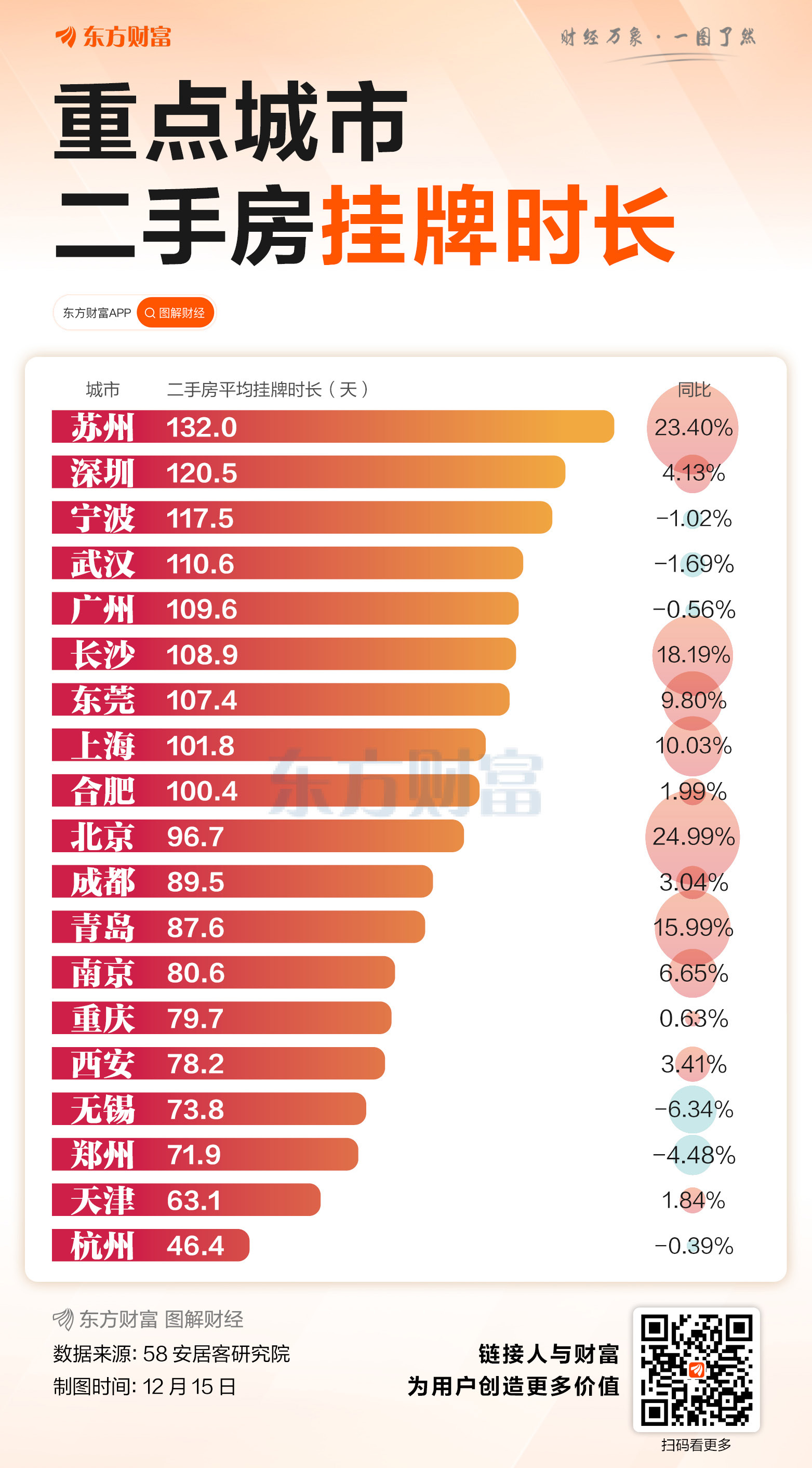 重点城市二手房挂牌时长:杭州最短 苏州最长 全新妙想投研助理,立即体验 ![]() 二手房流动性放缓态势延续。据58安居客研究院近日发布的《2025年11月二手房市场月报》,当月一线及新一线城市二手房平均挂牌时长多数增加。其中,北京同比增幅最大,达24.99%,苏州次之,同比增长23.4%;长沙同比增长18.2%,位列第三;青岛、上海也均同比增超10%。 具体挂牌时长方面,一线及新一线城市中有9城超过100天,其中苏州最高,达132天;深圳、宁波紧随其后,分别为120.5天、117.5天。此外,武汉、广州、长沙、东莞、上海、合肥等平均挂牌时长也均超过100天。平均挂牌市场最短的城市是杭州,仅为46.4天。 二手房挂牌时长是指房屋从在房产中介或交易平台挂牌出售开始,到最终成交或下架为止所经历的时间。这个指标反映了房屋在市场上的流通效率,是衡量二手房市场活跃度的重要参考。 一般而言,挂牌时长越短,说明房屋越受欢迎、成交速度越快,通常意味着该房源性价比高、地段好或市场行情较好;反之,挂牌时长越长,则可能表明房屋存在价格偏高、位置偏远、户型不佳等问题,或者市场整体较为冷清。购房者可以通过挂牌时长来判断房源的议价空间和成交难度。