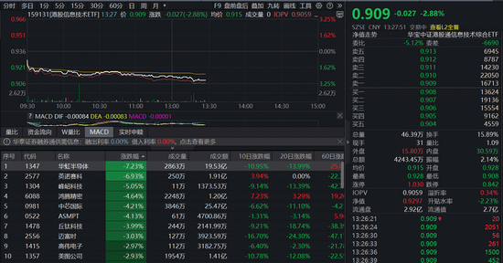 12月15日午后,港股芯片产业链持续走弱,华虹半导体跌逾7%,英诺赛科跌逾6%,峰G科技跌逾5%,中芯国际、鸿腾精密跌超4%。全市场首只聚焦“港股芯片”产业链的港股信息技术ETF(159131)场内价格现跌2.88%,实时成交额超4200万元,盘中溢价持续走阔,资金加速进场,截至发稿已获实时净申购600万份。