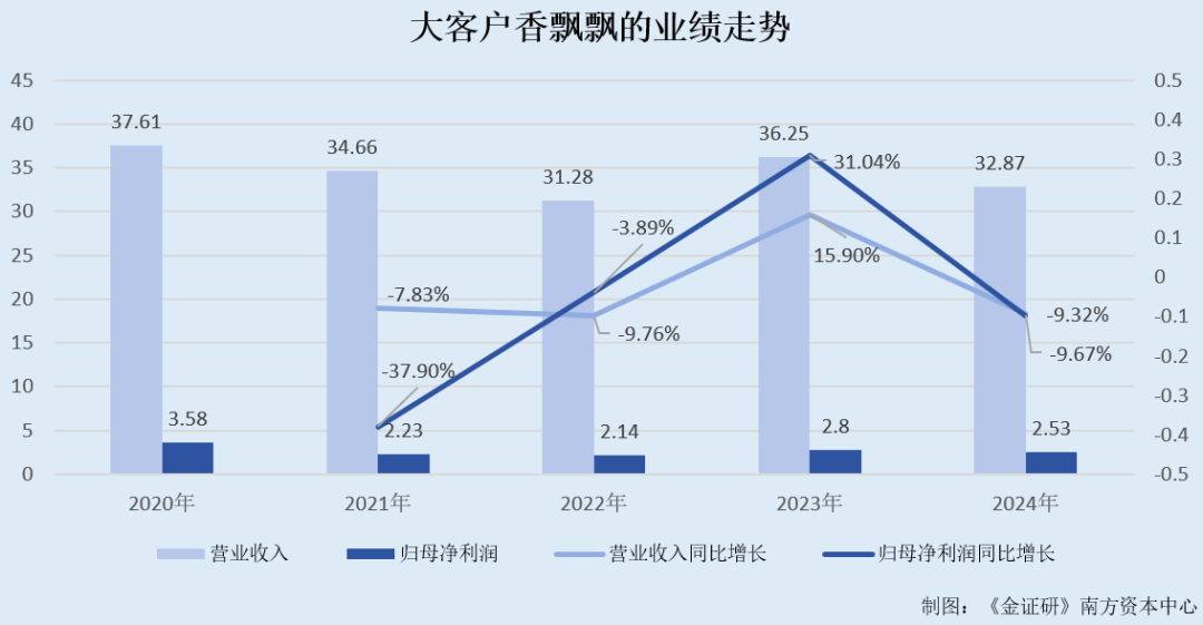 《金证研》南方资本中心 修远DL/作者 西洲 映蔚/风控 宣传“销量领先,杯子连起来可绕地球66圈”的香飘飘(603711),早在五年前推出香飘飘奶昔系列、飘飘茶系列,涉足泛冲泡领域。作为国内热成型食品容器行业的一员,新天力科技股份有限公司(以下简称“新天力”)的主要大客户也包括香飘飘。 且新天力称,随着终端即饮产品、现制茶饮产品市场的发展,可能挤占冲泡类产品的市场份额。在此背景下,新天力大客户香飘飘业绩与产销均下滑。此外,新天力境外业务收入及占比均逐年下滑,并称处于起步阶段,而同行境内外“双轮驱动”。另一方面,新天力实控人配偶间接持股的标签供应商累计撑起超亿元采购额,合作模式由客户指定毛利率偏高遭问询的情形,同样值得关注。 一、境外收入规模萎缩布局或落后于同行,境内大客户业绩与产销齐下滑 打铁还需自身硬。此番上市,新天力表示,随着终端即饮产品、现制茶饮产品市场的发展,可能挤占冲泡类产品的市场份额。 一方面,报告期内,新天力纸制食品容器的收入及占比均逐年下滑。并且,新天力的重要客户香飘飘近年来不仅业绩下滑,产销也下滑。需要说明的是,新天力对另一客户蜜雪冰城的销售额上升,但蜜雪冰城或也是新天力三家可比公司的客户之一。 1.1 即饮产品市场发展或挤占冲泡类产品的市场份额,大客户香飘飘业绩与产销齐下滑 近年来,新天力主要产品纸制食品容器的主营业务收入及占比均下滑。 据签署于2025年11月4日的《新天力科技股份有限公司招股说明书》(以下简称“签署于2025年11月4日的招股书”),2022-2024年及2025年1-6月,新天力纸制食品容器的主营业务收入分别为5,022.29万元、3,568.81万元、2,864.36万元、950.84万元,占主营业务收入的比例分别为5.36%、3.52%、2.63%、1.79%。 可见,报告期内,新天力的纸制食品容器的收入占比已经下降至不足3%。 且新天力表示,由于新天力主要纸制食品容器为各类冲泡奶茶杯、热饮杯,随着终端即饮产品、现制茶饮产品市场的发展,可能挤占冲泡类产品的市场份额,进而导致下游客户减少对新天力纸制食品容器的采购。 在即饮产品、现制茶饮产品市场发展的背景下,新天力大客户香飘飘业绩“双降”。 2022-2024年及2025年1-6月,香飘飘分别是新天力的第一大、第二大、第二大、第一大客户,新天力对香飘飘的销售金额分别为2.32亿元、2.42亿元、2.57亿元、1.25亿元,占比分别为24.53%、23.72%、23.31%、23.29%。 然而,近年来,香飘飘的业绩出现下滑。 据香飘飘定期报告,2020-2024年,香飘飘的营业收入分别为37.61亿元、34.66亿元、31.28亿元、36.25亿元、32.87亿元。2021-2024年,香飘飘的营业收入分别同比增长-7.83%、-9.76%、15.9%、-9.32%。 2020-2024年,香飘飘的归母净利润分别为3.58亿元、2.23亿元、2.14亿元、2.8亿元、2.53亿元。同期,香飘飘的归母净利润分别同比增长-37.9%、-3.89%、31.04%、-9.67%。