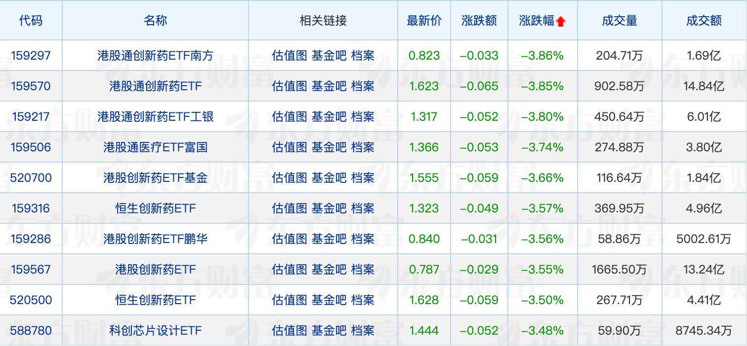 下跌方面,港股通创新药ETF集体回调,最大跌幅为3.86%。
