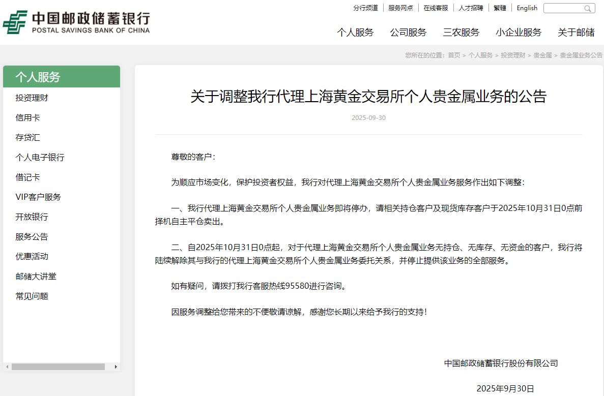 邮储银行9月30日宣布,该行代理上海黄金交易所个人贵金属业务即将停办,要求相关持仓客户及现货库存客户于10月31日0点前择机自主平仓卖出。同时自10月31日0点起,对于代理上海黄金交易所个人贵金属业务无持仓、无库存、无资金的客户,该行将陆续解除其与该行的代理上海黄金交易所个人贵金属业务委托关系,并停止提供该业务的全部服务。