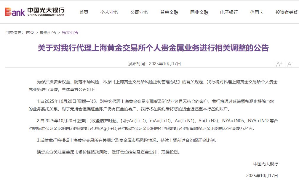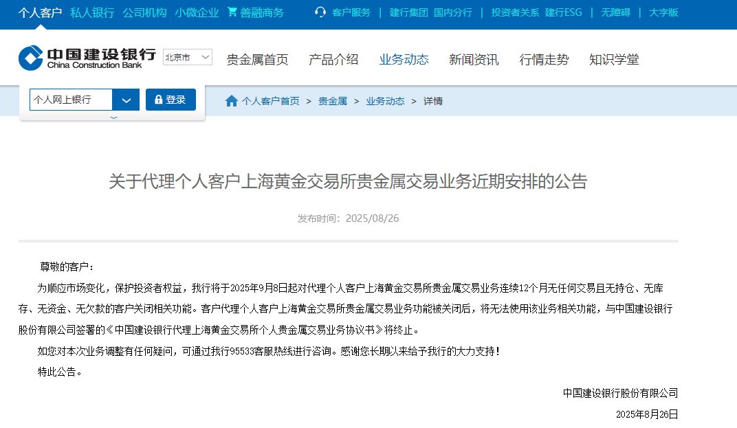 公告称,为顺应市场变化,保护投资者权益,我行对于代理上海黄金交易所个人贵金属交易业务将加强管理。无持仓、无库存、无欠款、保证金账户仍有资金余额的客户,请尽快自助办理资金转出手续。我行将自2025年12月19日起,将上述客户的保证金账户余额批量转出至该业务绑定的结算账户,并关闭相关业务功能。关闭后,客户与我行签署的《代理个人客户贵金属竞价交易业务协议书》将终止。 现有持仓客户的平仓交易不受本次业务调整影响,建议您后续持续关注本业务相关公告,控制持仓规模,防范市场风险。