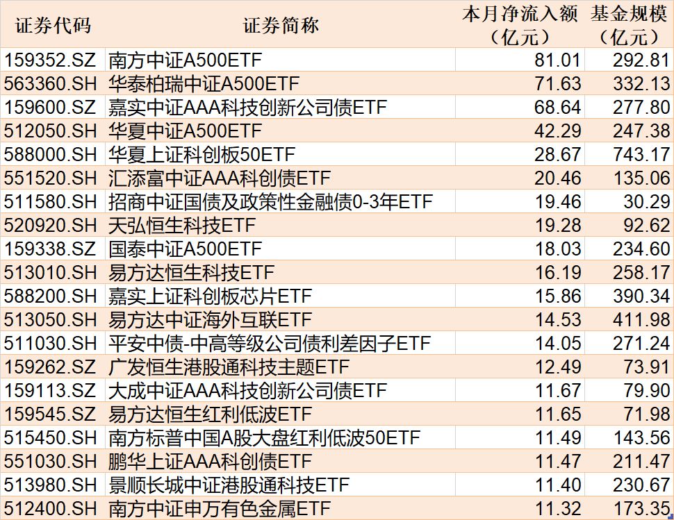与此同时,华泰柏瑞沪深300ETF份额减少2.29亿份,净流出额为10.71亿元;海富通中证短融ETF份额减少0.09亿份,净流出额为10.43亿元;国泰中证全指证券公司ETF份额减少5.13亿份,净流出额为6.18亿元。 截至12月15日,本月资金净流入额居前20的ETF名单如下: