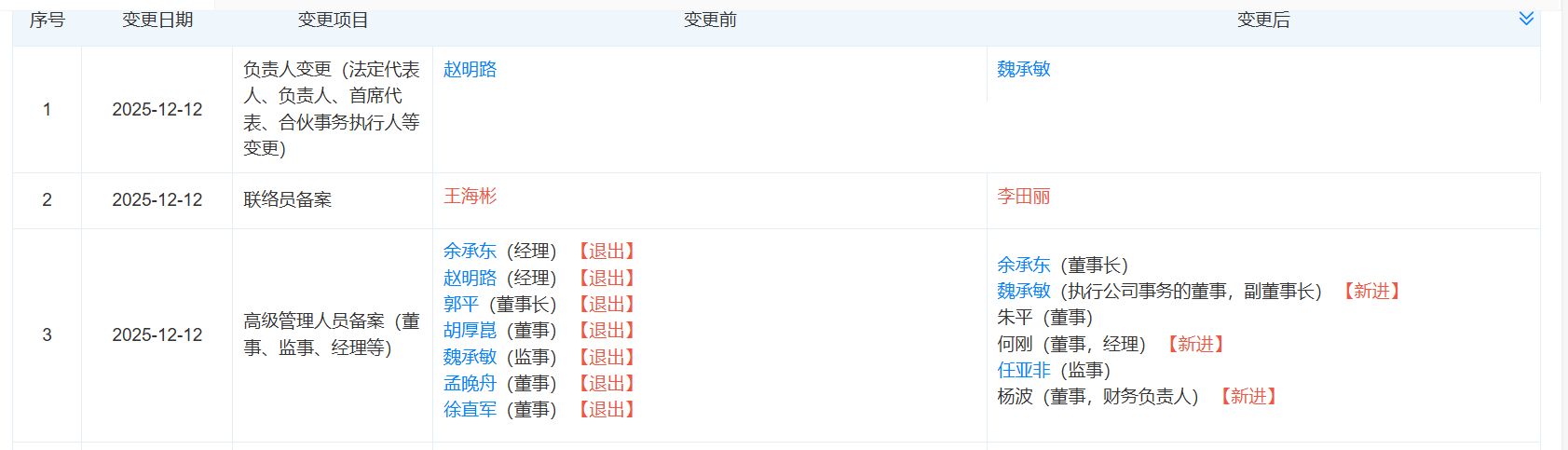 每经编辑|张锦河 国家企业信用信息公示系统及天眼查工商信息显示,近日,华为终端有限公司发生工商变更,郭平卸任董事长,由余承东接任,孟晚舟、徐直军等卸任董事,同时,多位高管发生变更。 华为终端有限公司成立于2012年11月,法定代表人为魏承敏,注册资本6.06亿人民币,经营范围含开发、生产、销售通信及电子产品、计算机、卫星电视接收天线、高频头、数字卫星电视接收机及前述产品的配套产品,并提供技术咨询和售后服务等。股东信息显示,该公司由华为终端(深圳)有限公司全资持股。