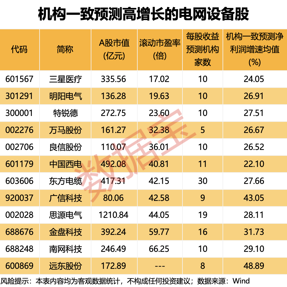 “十五五”时期,电网投资有望迎来新一轮增长。 商业连锁龙头逆市涨停 今日(12月16日)早盘,A股市场再现调整,上证指数下跌1.22%,创业板指下跌2.35%,科创50指数下跌2.02%。盘面上超4400股飘绿,智能驾驶与日常消费相关的题材逆市走强。 截至上午收盘,商业连锁板块中,龙头股永辉超市录得涨停板,涨停板封单173.77万手。百大集团、欧亚集团、中央商场、广百股份、红旗连锁、利群股份等也涨停。其中百大集团(600865)目前已连续收获4个涨停板,是商业连锁板块中连板次数最多的个股。 百大集团12月15日晚间发布风险提示公告称,经公司自查,公司目前尚未发现可能或已经对公司股票交易价格产生影响的媒体报道或市场传闻和涉及热点概念的事项。 百大集团还发布了一则股东提前终止减持计划的公告。公告显示,公司持股5%以上的股东西子联合控股有限公司(简称“西子联合”)持有公司4558.58万股,占公司总股本的12.11%。西子联合与其一致行动人陈桂花合计持有公司股份总数5783.55万股,占公司总股本的15.37%。 西子联合出于自身资金需求,曾计划自2025年12月8日日至2026年3月6日期间通过集中竞价、大宗交易方式减持公司股票不超过1128.72万股,减持比例不超过公司总股本的3%。 截至本公告披露日,西子联合上述减持计划尚未实施完毕,但根据实际情况及资金安排,西子联合决定提前终止本次减持计划。 全社会用电量首超10万亿千瓦时 据人民日报,记者从2026年全国能源工作会议上获悉:今年全国发电总装机预计超过38亿千瓦,同比增长14%,全社会用电量首超10万亿千瓦时。“1万亿千瓦时”便相当于日本全年的用电量总和,7月和8月全社会用电量连续超过1万亿千瓦时,我国有力有效应对迎峰度夏电力负荷20次,超去年峰值考验。 中国电力企业联合会统计与数智部副主任蒋德斌说,全社会用电量首超10万亿千瓦时,这不仅标志着我国用电规模稳居世界首位,更成为中国经济与能源发展进程中的重要里程碑。 国家能源局有关负责人表示,“十四五”以来,我国能源自给率从80%左右增至84%以上,建成全球最大的可再生能源体系,能源体量规模稳居世界第一。 “十五五”时期电网投资额有望显著提升 AI发展带来用电需求激增。今年1~10月,我国互联网数据服务用电量同比增长43%。“算力的尽头是电力”已逐步成为全球共识,微软CEO纳德拉近期多次公开表示,当前人工智能产业面临的核心瓶颈为电力短缺。 花旗银行表示,在全球电力需求被AI数据中心、电气化和可再生能源并网大举推高的背景下,叠加美联储降息周期降低融资成本,助推电网基建长期项目投资。 中信证券指出,国内政策进一步指引和夯实了特高压、柔性直流输配电、数智化电网等环节的中长期机遇。同时,中短期来看,输变电设备内外需景气共振,结构性需求持续显现,特高压、智能电网等环节有望迎来景气反转。 华泰证券指出,全国统一电力市场建设加速推进,预计“十五五”时期电网投资有望达到4万亿元以上,相比于“十四五”时期电网投资的2.8万亿元显著提升。其中,主网建设助力全国电网网架实现互联互通,是全国统一电力大市场搭建的重要支撑,将是未来重点建设方向。 电网设备板块市场表现强劲 据证券时报·数据宝统计,截至12月15日收盘,A股电网设备指数年内涨幅达到34.77%,超同期上证指数19个百分点以上。电网设备股合计A股市值达到1.62万亿元,其中3股A股市值超1000亿元,分别为国电南瑞、思源电气、特变电工。 从个股来看,10只电网设备股年内累计涨幅翻倍,包括华通线缆、智洋创新、灿能电力、洛凯股份、红相股份等。 ![]() 华通线缆年内累计涨幅201.06%,排在首位。公司是我国电缆制造业中研发与工艺技术领先的企业之一,已取得美国UL、欧盟CE、德国TUV等多项国际认证,以及中国CRCC、CCC等国内强制性认证,是我国获UL认证大类最全的企业之一。 未来增长潜力方面,根据5家及以上机构一致预测,2026年、2027年净利润增速均有望超20%的电网设备股有12只。 机构一致预测净利润增速均值最高的是远东股份,达到48.89%。公司目前已实现全球领先人工智能芯片公司高速铜缆、智驾数据传输线、车载线、电源线及连接器等批量供货。 浙商证券认为,远东股份坚持智能缆网、智能电池、智慧机场一体两翼产业布局,传统业务持续改善向好,AI新业务有望贡献业绩及估值弹性。 上述12只高增长潜力的电网设备股中,截至12月15日收盘,滚动市盈率低于30倍的有3只,分别是三星医疗、明阳电气、特锐德。 三星医疗滚动市盈率为17.02倍,排在最低位置。今年前三季度,公司实现净利润15.28亿元,同比下滑15.85%。 华泰证券认为,三星医疗海外配电订单保持高速增长,后续延续性订单毛利率有望逐步回升。同时,公司海外用电持续突破,医疗业务逐步修复。伴随国内新标表启动招标,预计后续价格有望明显回升。 ![]()