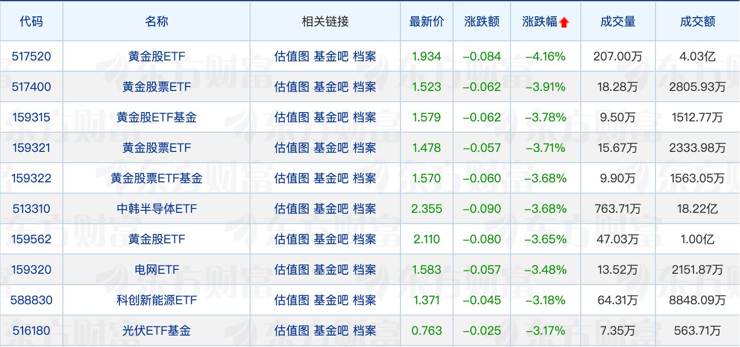 下跌方面,黄金股ETF集体回调,最高下跌4.16%。
