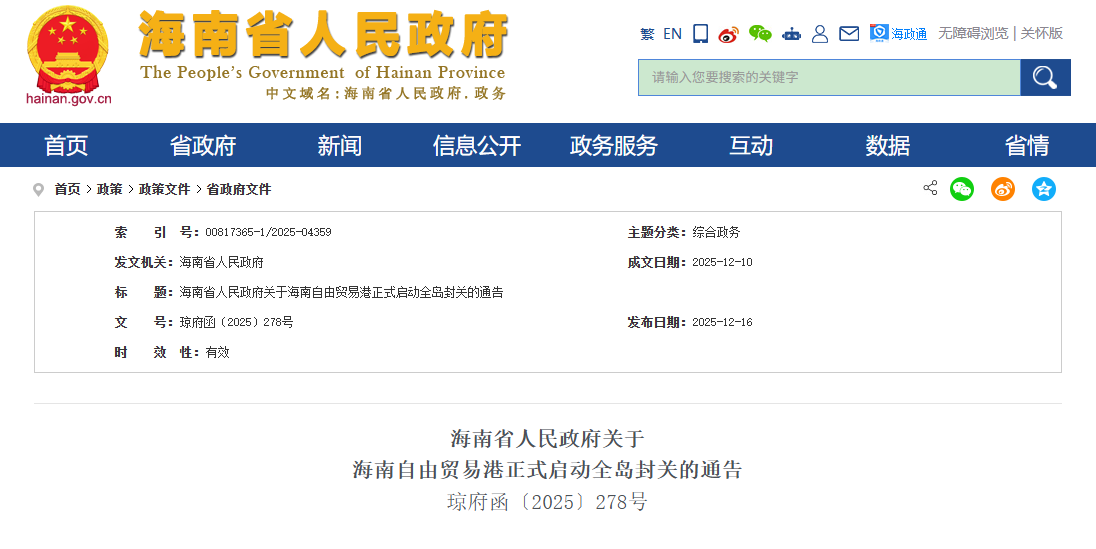图片来源:摄图网_500748281 12月16日,海南省人民政府发布《关于海南自由贸易港正式启动全岛封关的通告》,详情如下: 一、自2025年12月18日起,海南自由贸易港正式启动全岛封关。 二、《关于海南自由贸易港货物进出“一线”“二线”及在岛内流通税收政策的通知》(财关税〔2025〕12号)、《关于海南自由贸易港进口征税商品目录的通知》(财关税〔2025〕13号)、《中华人民共和国海关对海南自由贸易港加工增值免关税货物税收征管暂行办法》(海关总署公告2025年第158号)、《海南自由贸易港禁止、限制进出口货物、物品清单》(商务部公告2025年第43号)、《中华人民共和国海关对海南自由贸易港监管办法》(海关总署公告2025年第159号)等系列文件,根据上述文件的规定,自正式启动全岛封关之日起施行。