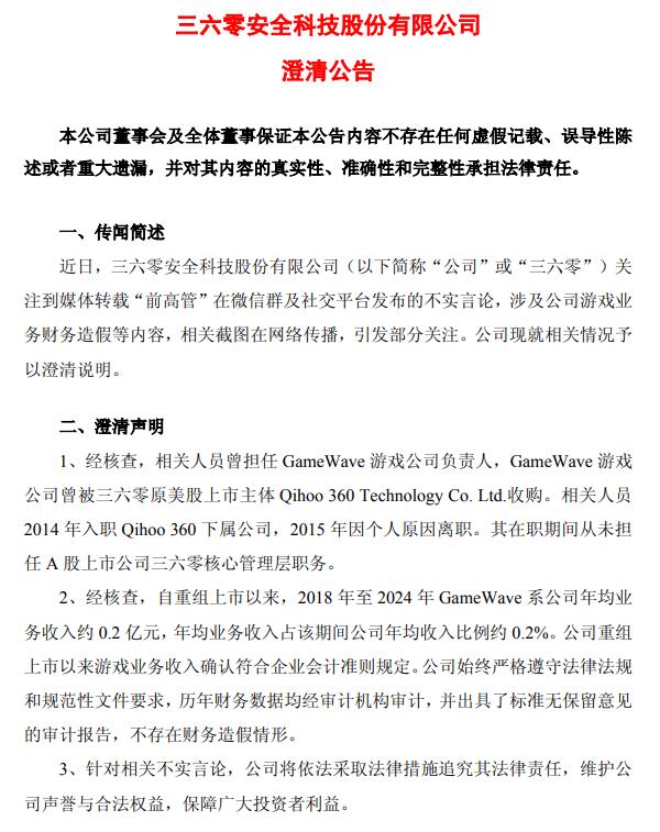 专业金融数据,下一代智能终端 12月16日,三六零发布澄清公告,近日,三六零安全科技股份有限公司关注到媒体转载“前高管”在微信群及社交平台发布的不实言论,涉及公司游戏业务财务造假等内容,相关截图在网络传播,引发部分关注。公司现就相关情况予以澄清说明。 1、经核查,相关人员曾担任GameWave游戏公司负责人,GameWave游戏公司曾被三六零原美股上市主体Qihoo360TechnologyCo.Ltd.收购。相关人员2014年入职Qihoo360下属公司,2015年因个人原因离职。其在职期间从未担任A股上市公司三六零核心管理层职务。 2、经核查,自重组上市以来,2018年至2024年GameWave系公司年均业务收入约0.2亿元,年均业务收入占该期间公司年均收入比例约0.2%。公司重组上市以来游戏业务收入确认符合企业会计准则规定。公司始终严格遵守法律法规和规范性文件要求,历年财务数据均经审计机构审计,并出具了标准无保留意见的审计报告,不存在财务造假情形。 3、针对相关不实言论,公司将依法采取法律措施追究其法律责任,维护公司声誉与合法权益,保障广大投资者利益。 ![]()