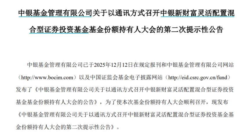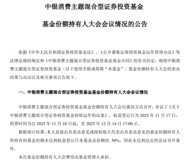 财联社12月16日讯(记者周晓雅)即便在主动权益基金整体表现回暖的今年,依旧不乏迷你基面临清盘与否的命运。 12月16日,中银基金发布关于中银新财富灵活配置基金份额持有人大会的第二次提示性公告。具体来看,因截至7月23日基金规模为1899万元,该基金已连续60个工作日出现基金资产净值低于5000万元的情形,因而召开基金份额持有人大会,审议持续运作的议案。 ![]() 同日,中银基金旗下另一只基金——中银消费主题混合则是披露近期举办的基金份额持有人大会会议情况。因出具表决意见的持有人合计基金份额未达到权益登记日该基金总份额的一半,因此未达到法定的会议召开条件,此次基金份额持有人大会费用由中银基金承担。 这也是该基金第二次出现未达到法定会议召开条件的情况,两度计划召开持有人大会意在持续运作产品。 ![]() 今年以来,中银基金频频出现对旗下产品的保壳动作,迷你基集中的混合型产品也成为该公司保壳的主要对象。而随着中银基金迎来新任掌舵人,如何补足权益短板也受到持续关注。 从机构定制产品到迷你基 公开资料显示,中银新财富在2015年11月19日成立,成立初时,或是机构定制产品。该基金的第一份中报显示,截至2016年上半年末,该基金规模为5.5亿元,机构的持有份额占比达到97.6%。随后1年间,该基金依旧维持着机构投资者九成以上的仓位占比,规模曾超过6亿元。 但到了2017年底,随着机构投资者的大额赎回,该基金迅速缩水至2亿元以内;直至2019年上半年底规模又重回4亿元以上,同样出现了机构投资者的大额申购。事实上,该基金每次规模大幅变动的节点都对应着机构投资者的大额申赎,最近的一轮规模回落从去年下半年开始,至今年上半年,该基金的规模已经从6.18亿元缩水至2000万元以内。 作为一只灵活配置型基金,截至目前该基金成立以来净值回报79.29%,在同类基金处于中流水平。此前产品的股票仓位多在50%以下,但在2023年三季度开始增加权益资产仓位,一个季度之间股票仓位从8.9%提升至90.36%,随后一直维持九成以上股票仓位直到今年三季度末。 不过,提前加仓股票并未为给该基金业绩带来太大起色,年内该基金净值仅上涨3.11%,跑输业绩比较基准,在同类产品处于后20%的水平。这或是因为产品重仓在红利资产,产品三季报提到关注中证红利指数的投资机会,在行业和风格等方面约束较为严格。 宣布召开持有人大会的同时,该基金在昨日还变更基金经理,新任基金经理李雪此前未有公募产品管理经验;因工作安排离任的基金经理赵志华,此前的在管多是公募量化产品或是指增产品。 多只迷你基召开持有人大会未果 年内第二次持有人大会未成功召开的中银消费,也成立超过了10年,早在2013年4月成立时规模超过10亿元,但在同年底就迅速缩水到2亿元以内。随后的10年间,该基金定期报告披露的规模数据鲜少超过2亿元。 虽然长期为“迷你基”,但产品业绩表现曾有不少“高光”时刻,作为产品第一任基金经理,曾任中银基金投资总监的甘霖掌管该基金逾2年获得超60%的任职回报;随后钱亚风云接管该产品长达6年,任期回报同样超过40%;不过目前掌管的产品基金经理杨庆运,在2021年底开始接管,经历近3年的熊市行情后,产品净值在今年以来仍未见修复,年内净值几乎没有上涨,任职4年总回报仍亏损38.99%。 而甘霖、钱亚风云均是因为个人原因离任产品,前者在离职后曾投身私募领域,后重回公募,加入博时基金;后者则是跳槽至中欧基金。 中银基金年内多次对旗下产品保壳,主动权益型产品占比较多。数据显示,中银中小盘成长、中银数字经济、中银鑫利、中银美丽中国、中银远见成长等多只产品均在年内宣布召开持有人大会,多是因迷你基审议持续运作的议案,但大多数未成功召开。 Wind数据显示,截至今年9月底,中银基金旗下有26只基金规模低于5000万元,其中23只混合型产品或股票型产品,占公司旗下这两类产品总数的三成以上。 掌舵人更迭后如何补短板? 迷你基集中在上述领域,也与公司的短板相关。作为一家银行系公募,固收类基金是中银基金公募产品规模的主要构成。 截至9月底,该公司在管公募规模7102.08亿元,其中,货基规模3767.12亿元、债基规模2956.6亿元,而股票型和混合型基金的合计规模则不足300亿元。 这一规模结构,曾在去年债牛行情中助力公司公募规模增长超过2200亿元,但年内股市整体走强的背景下,规模则增长较为乏力,前三季度规模增长914.48亿元,公募规模排名下滑1位至第20。 不过,近日,中银基金迎来新任掌舵人。来自曾在股东中国银行多部门任职的刘信群,自12月10日起担任中银基金董事长、法定代表人,执行总裁张家文不再代为履行董事长、法定代表人职责。 公开资料显示,刘信群历任中国银行司库助理总经理,中国银行深圳市分行行长助理、党委委员,中国银行深圳市分行副行长、党委委员,中国银行(香港)有限公司风险管理部总经理,中国银行司库总经理,中国银行深圳市分行行长、党委书记,兼任深圳市第七届人大代表、深港金融合作委员会委员。 随着新任董事长到来,公司如何补短板也受业内关注。近日,中银基金也曾对外发声称,在能力建设上,重点增强主动权益投资能力,同时布局指数化投资、量化策略、FOF、海外市场及REITs等领域,致力于构建面向未来的综合投研实力。 |