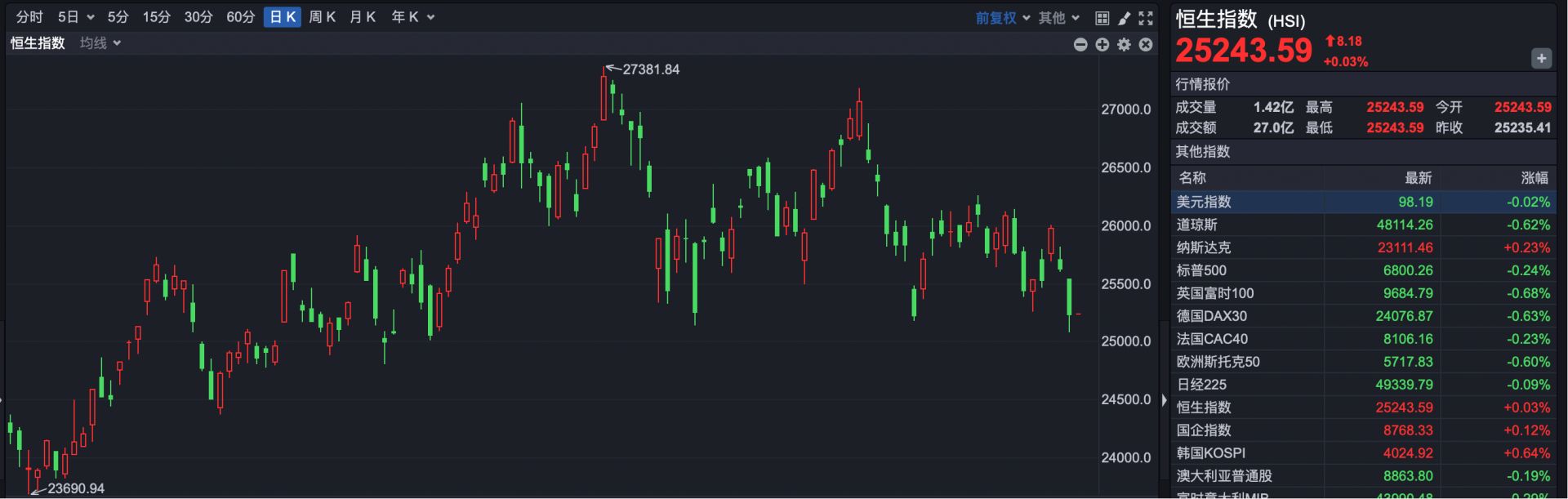 每经记者|曾子建 每经编辑|袁东 连续两天下跌之后,12月17日早盘,港股市场跌势趋缓,主要指数微幅高开。 截至发稿,恒生指数报25243.59点,上涨8.18点,涨幅0.03%。