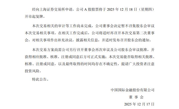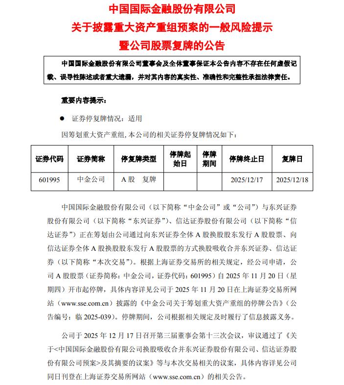 中金公司(601995.SH)公告称,公司与东兴证券、信达证券正在筹划由中金公司通过换股方式吸收合并东兴证券、信达证券。公司A股股票自2025年11月20日起停牌,于2025年12月18日开市起复牌。本次交易方案尚需公司另行召开董事会再次审议及股东会审议批准,并取得相应批准、核准、注册或同意后方可实施。