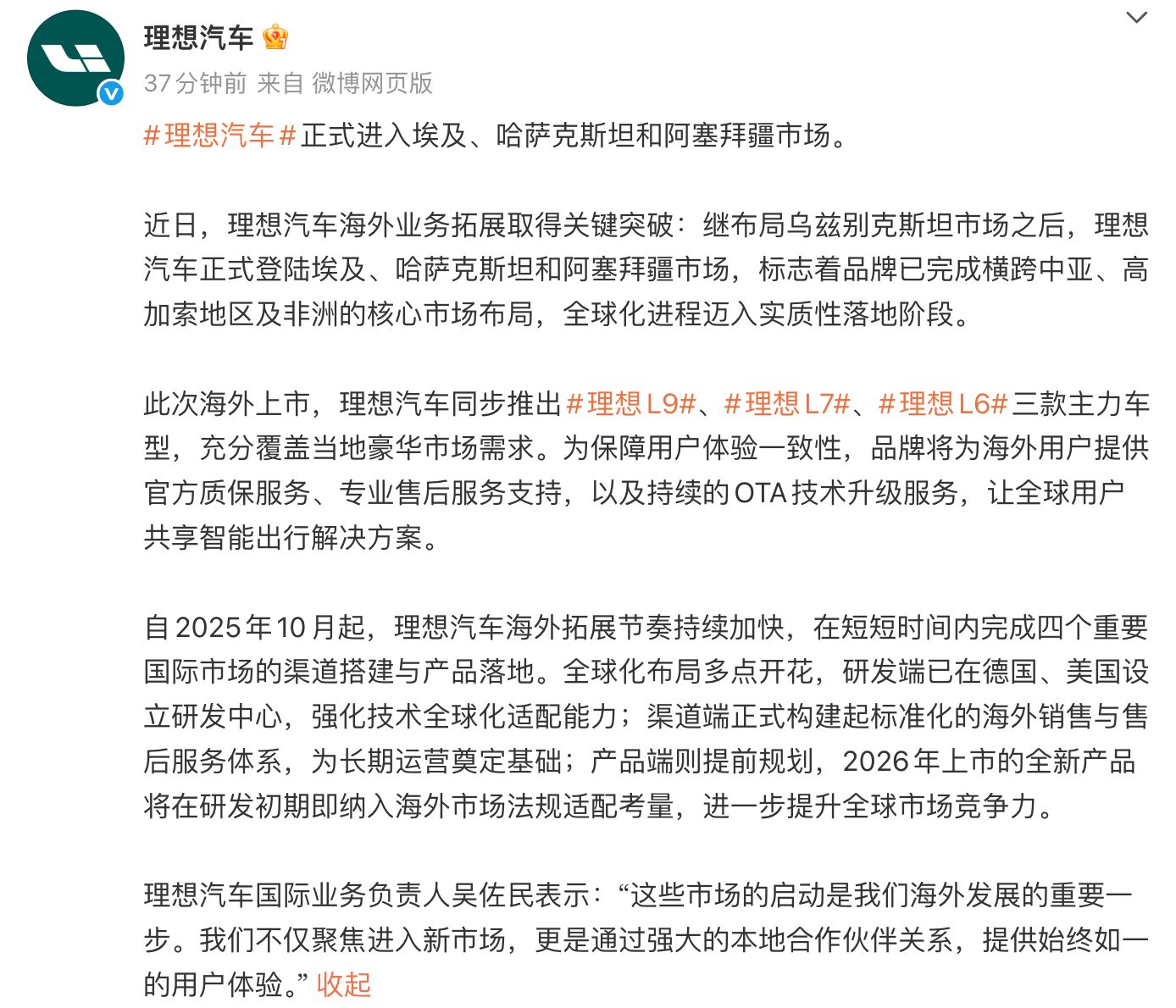 凤凰网科技讯 12月17日,理想汽车官方宣布,继布局乌兹别克斯坦市场之后,理想汽车正式登陆埃及、哈萨克斯坦和阿塞拜疆市场,同步推出理想L9、理想L7、理想L6三款主力车型,并为海外用户提供官方质保服务、专业售后服务支持,以及持续的OTA技术升级服务。
