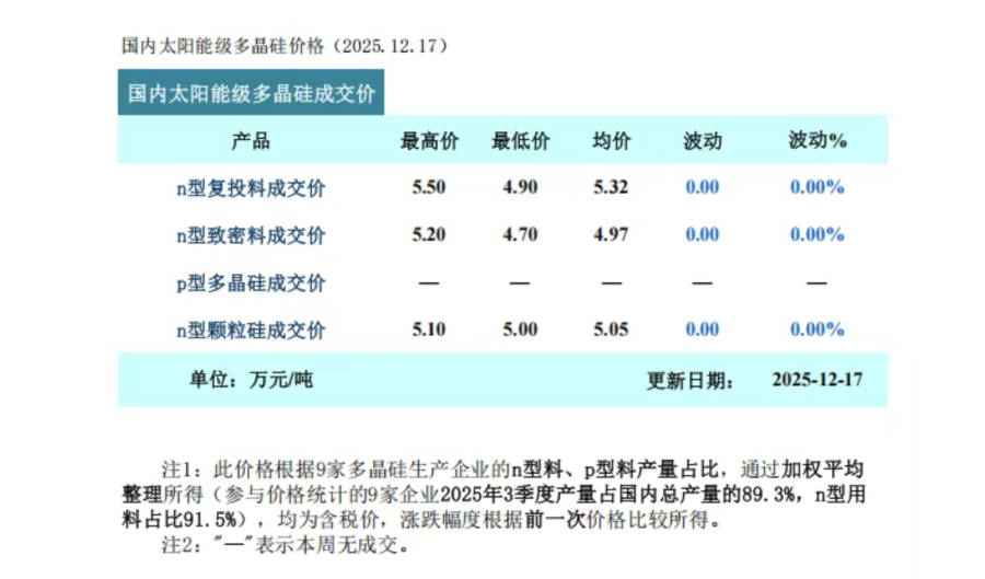 ![]() 本周多晶硅报价数据图片来源:硅业分会 尽管最新一期的硅料价格保持稳定,但市场消息称多数多晶硅企业新单报价均已上调。 12月17日,中国有色金属工业协会硅业分会(下称硅业分会)发布的数据显示,据安泰科统计,本周多晶硅N型复投料成交价格区间为4.9万-5.5万元/吨,成交均价为5.32万元/吨;N型颗粒硅成交价格区间为5.0万-5.1万元/吨,成交均价为5.05万元/吨。 与上周相比,硅料价格环比持平。但硅业分会表示,本周多数多晶硅企业均将新单报价上调至6.5万元/吨以上。这与当前价格相比上涨超过20%。 “本周国内多晶硅市场呈现‘成交清淡、报价探涨’的局面。”硅业分会称,本周主流签单企业数量进一步减少,新签订单几乎停滞。 硅业分会也指出大多数硅料企业上调报价的原因:“业内普遍预期2026年一季度末终端需求有望好转。此时上调报价,主要是向市场传递坚决稳价的信号,为下游硅片、电池片环节的价格企稳提供底部支撑。” 不过,6.5万元/吨的市场报价略高于预期。根据期货市场的数据,截至12月17日,多晶硅期货2601、2602、2603分别报收约6.24万元/吨、6.22万元/吨、6.20万元/吨。 整体来看,目前多晶硅市场高库存和弱需求的基本面仍未改变。 根据预测,2025年国内多晶硅产量约133万吨,而下游硅片所对应硅料需求约126万吨。但硅业分会也认为,稳价共识正在主导当前的市场情绪。“预计短期内,下游需求和价格暂无好转的情况下,多晶硅市场实际成交量仍将有限,但主流企业维持价格坚挺的态度十分明朗,报价上调更是传递对产业链稳定过渡的决心。” 目前,业内已将明年1、2月份视作关键过渡期,在这一时段内保持产业链价格体系和库存的稳定至关重要。“若明年1-2月份产业链能维持库存及价格的平稳过渡,待终端需求回暖,市场有望逐步走出低谷。”硅业分会表示。 21世纪经济报道记者注意到,近期多晶硅市场稳价信号愈发明显。其中一个重要的表现便是硅料收储平台公司的正式成立。 12月9日,有消息称一家名为“北京光和谦成科技有限责任公司”(下称光和谦成)即为业内盼望已久的硅料收储平台公司。该公司已在当天注册成立,注册资本为30亿元,注册地址在北京市朝阳区垡头化工东里3号36号楼6层B6221房间。 21世纪经济报道记者发现,光和谦成的股东共计10位,分别为:通威光伏科技(峨眉山)有限公司、协鑫科技咨询服务(苏州)有限公司、上海东方希望新能源科技有限公司、新疆大全新能源股份有限公司、新特能源股份有限公司、亚洲硅业(青海)股份有限公司、青海丽豪新能源科技有限公司、北京中光同合能源科技有限公司、新疆戈恩斯能源科技有限公司、青海南玻新能源科技有限公司。 尽管工商信息平台显示上述公司的持股人呈现持股比例的差异,但是有知情人士告诉21世纪经济报道记者:“光和谦成不存在谁是大股东,也无实控人。” 12月12日,中国光伏行业协会官方微信号发文再次确认了硅料收储平台公司成立的重要性——“近日,北京光和谦成科技有限责任公司完成注册,标志着光伏行业酝酿已久的‘多晶硅产能整合收购平台’正式落地。” 文章指出,这一由相关主管部门联合指导、多家龙头骨干企业共同发起的产业治理创新,被业内视为破解光伏“内卷式”恶性竞争的关键之一。“该平台拟采取‘两条腿走路’的创新模式,实行‘承债式收购+弹性利用产能’的双轨模式运行,旨在通过市场化、法治化的机制,通过‘政府引导+行业协同+市场化并购’的路径,以产业链源头环节为抓手,探索整治全行业‘内卷式’恶性竞争问题,具有巨大的战略价值。” 文章还表示,该平台承接数百亿元级潜在债务,可帮助化解银行与供应商危机,推动价格回归合理区间,恢复全产业链“造血”功能。 (文章来源:21世纪经济报道) |