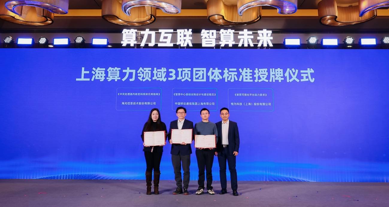 三项团体标准分别为:由中国移动通信集团上海有限公司牵头起草的《智算中心基础设施设计与建设规范》,海光信息技术股份有限公司牵头起草的《中央处理器内嵌密码模块应用指南》,恒为科技(上海)股份有限公司牵头起草的《智算可视化平台能力要求》。
