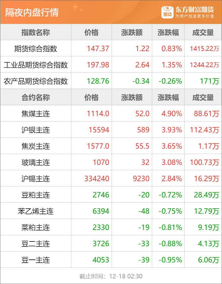 隔夜行情![]() ![]() 每日精选碳酸锂期货价格飙涨!“亚洲锂都”大动作 实际影响有多大? 又创新高!白银年内涨超125%成黑马 机构解读后市 国家发改委等部门:对标国内外煤炭最严格污染物排放要求 完善煤炭清洁高效利用标杆水平 宏观产经界面新闻:国家发展改革委等部门发布《煤炭清洁高效利用重点领域标杆水平和基准水平(2025年版)》。其中提到,鼓励和引导行业企业结合实际和长远发展,对项目实施改造升级。对新建煤炭开发利用项目和有条件的存量项目,推动清洁高效利用水平应提尽提,力争达到标杆水平。对清洁高效利用水平低于现有基准水平的存量项目,引导企业有序开展煤炭清洁高效利用改造,加快推动企业减污降碳,坚决依法依规淘汰落后产能、落后工艺。 广期所:近期,影响市场运行的不确定性因素较多,相关品种价格波动较大。请各市场主体加强风险防范,理性合规参与市场,维护市场平稳运行。广州期货交易所将持续强化日常监管,严肃查处各类违规行为,维护市场正常秩序。 财政部网站:1—11月,印花税4044亿元,同比增长27%。其中,证券交易印花税1855亿元,同比增长70.7%。据财政部此前发布的数据,2025年1—10月证券交易印花税收入为1629亿元,这意味着今年11月证券交易印花税为226亿元,相较于10月的181亿元环比增长24.86%。此外,2024年11月证券交易印花税为221亿元,经计算,今年11月证券交易印花税同比微增2.26%。 品种资讯 黑色系期货 钢材:本周,唐山主流样本钢厂平均钢坯含税成本3055元/吨,周环比下调10元/吨,与12月17日当前普方坯出厂价格2940元/吨相比,钢厂平均亏损115元/吨。 12月17日,全国300家长、短流程代表钢厂废钢库存总量524.47万吨,增0.22%;库存周转天7.9天,持平;日消耗总量56.00万吨,增0.25%;日到货总量57.14万吨,增0.14%。(我的钢铁网) 硅铁:2025年硅铁产能合计983.7万吨,1-11月产量合计509.55万吨。据不完全统计,2025年全年硅铁新增产能有限,主要集中在甘肃及内蒙古。(我的钢铁网) 煤炭:国际能源署(IEA)预测,2025年全球煤炭需求将达到历史新高88.5亿吨;展望未来,IEA预计到2030年煤炭需求将下降3%,主要来自于可再生能源、核能和天然气市场的激烈竞争;IEA高管指出,全球煤炭需求正达到峰值,并将在2030年开始以非常缓慢且渐进的方式下降。(财联社) 12月17日海运炼焦煤港口现货稳中有涨。供应方面,港口现货仍以去库为主,到港以俄、澳、加为主,港口成交亦以俄、加为主;需求方面,产地竞拍成交状况见好,焦钢企业阶段性补库行为显现;情绪方面,今日盘面走势震荡小幅上涨,部分煤种成交价上涨5-10元/吨。(我的钢铁网) 农产品期货 玉米:2025年11月,全国工业饲料产量2873万吨,环比减少1.2%,同比增长2.7%。其中,配合饲料、浓缩饲料、添加剂预混合饲料同比分别增长2.6%、4.5%、0.1%。主要饲料产品出厂价格同比下降,畜禽配合饲料、浓缩饲料、添加剂预混合饲料出厂价格环比以降为主。饲料企业生产的配合饲料中玉米用量占比为43.8%,配合饲料和浓缩饲料中豆粕用量占比为14.0%。(中国饲料工业协会) 棕榈油:据船运调查机构SGS公布数据显示,预计马来西亚12月1日-15日棕榈油出口量为435882吨,较前一月同期出口的334295吨增加30.39%。(新华财经) 豆粕:据Mysteel,12月17日,全国主要油厂豆粕成交15.00万吨,较前一交易日增11.45万吨,其中现货成交4.90万吨,较前一交易日增2.61万吨,远月基差成交10.10万吨,较前一交易日增8.84万吨。当日全国动态全样本油厂开机率升至60.06%。(我的钢铁网) 有色/贵金属期货 沪银:全球最大白银ETF--iShares Silver Trust跃升3%,创下历史新高。(财联社) 碳酸锂:据我的钢铁网(Mysteel)数据显示,12月17日MMLC电池级碳酸锂(早盘)价格较前一日上涨3500元/吨,中间价报101300元/吨。(Mysteel) 多晶硅:12月17日,中国有色金属工业协会硅业分会发布的数据显示,据安泰科统计,本周多晶硅N型复投料成交价格区间为4.9万-5.5万元/吨,成交均价为5.32万元/吨;N型颗粒硅成交价格区间为5.0万-5.1万元/吨,成交均价为5.05万元/吨。与上周相比,硅料价格环比持平。但硅业分会表示,本周多数多晶硅企业均将新单报价上调至6.5万元/吨以上。这与当前价格相比上涨超过20%。(21财经) 能化期货 原油:美国上周EIA原油库存减少127.4万桶,预期减少205万桶,前值减少181.2万桶。美国上周EIA库欣地区原油库存变动减少74.2万桶,前值增加30.8万桶。美国上周EIA汽油库存增加480.8万桶,预期增加195万桶,前值增加639.7万桶。 据央视新闻报道,委内瑞拉国家石油公司(PDVSA)发布公告通报称,委内瑞拉原油及石油产品出口业务正在正常开展。公告称,与委内瑞拉国家石油公司相关的油轮仍继续在充分的技术支持和运营保障下航行,合法行使自由航行权利。自由航行与自由贸易的权利受到国际法的广泛承认和保护。委内瑞拉国家石油公司重申其捍卫委内瑞拉玻利瓦尔共和国能源主权、履行合法商业承诺及保护海上运营的决心,重申始终遵循宪法、国际海事法及《联合国宪章》原则行事。(财联社) 塑料:截至12月17日,中国聚乙烯生产企业样本库存量48.87万吨,较上期上涨1.72万吨,环比上涨3.65%,库存趋势维持上涨。主因近期生产企业出厂价下调放缓,主动去库意向减弱,但是市场价格呈下跌趋势,贸易商观望气氛增强开单放缓。其次因为下游工厂开工率维持下跌趋势,刚需补库力度减弱,消化市场低价资源为主。所以生产企